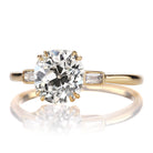 The Benedicte 1.74 ring is a VB original design made right here in NYC. The ring centers a GIA-certified 1.74-carat old European cut diamond of K color, I1 clarity. The stone is set in a four-double-prong 18kt yellow gold setting with a horizontal baguette on each shoulder. The ring is currently size 6 and can be resized!