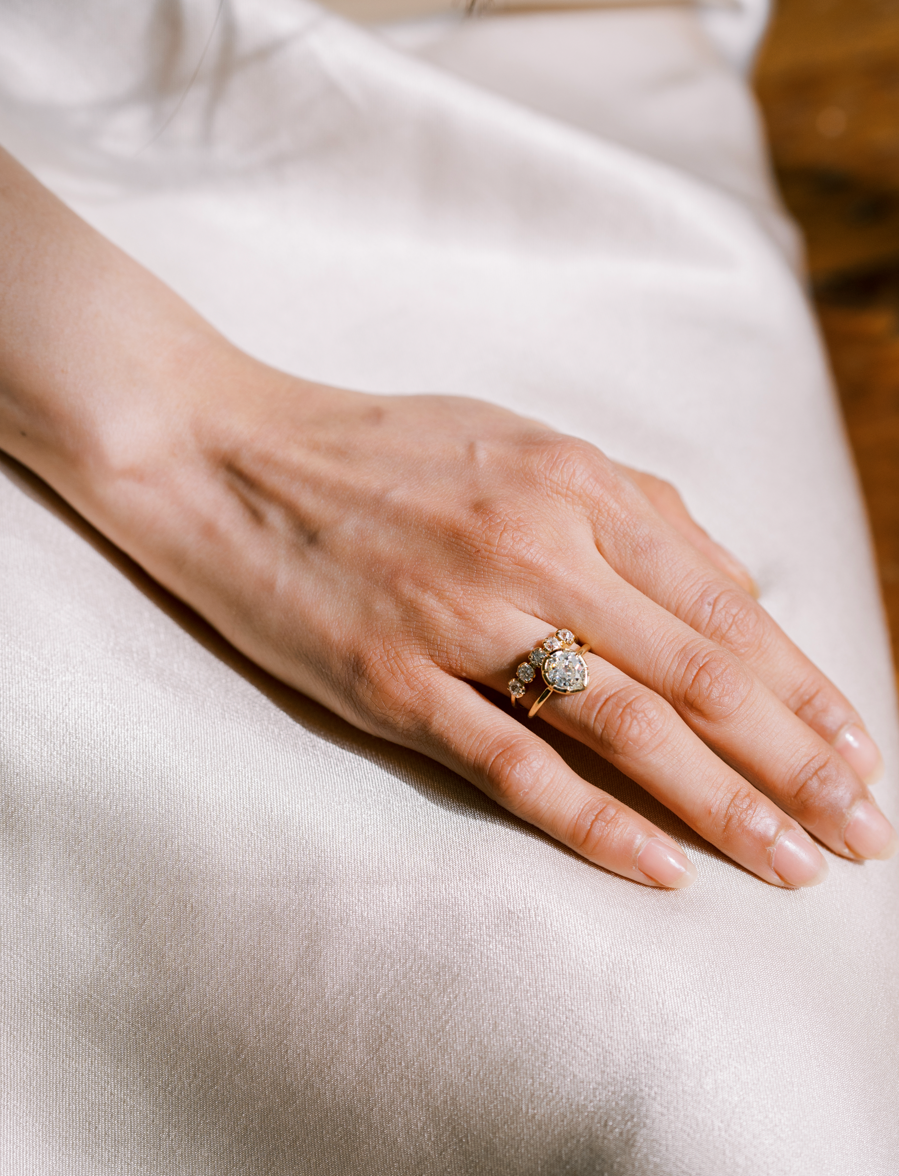 The Allie 1.75 ring is a VB original design made right here in NYC. The ring centers a GIA-certified 1.75-carat Pear cut diamond of M color, VS2 clarity. The stone is set in an 18kt yellow gold collet setting. The ring is currently sized 6+ and can be resized!