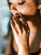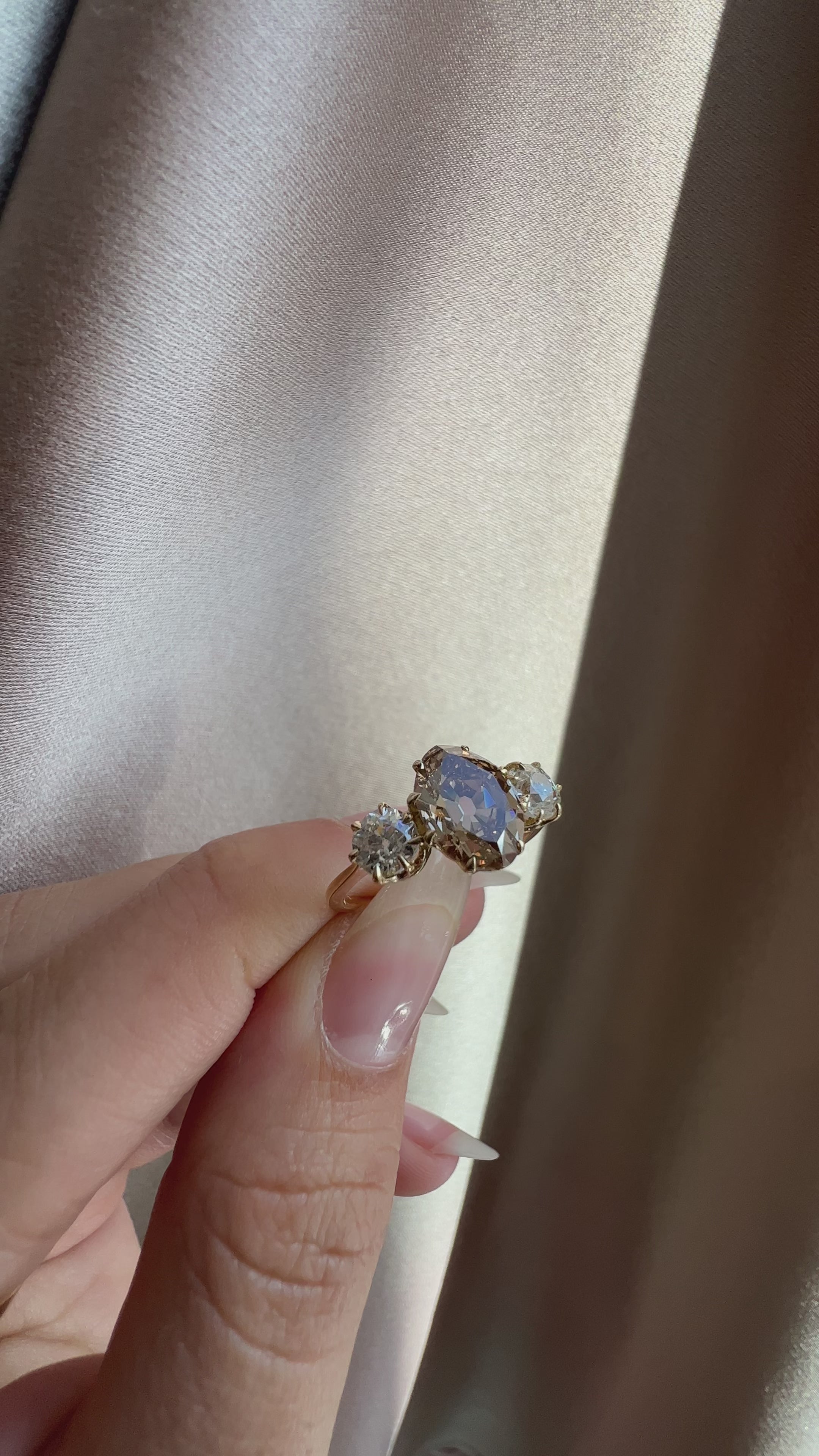 This Marielle centers an antique-style diamond in a rich and syrupy orange-brown color. Her elongated oval shape flatters any finger, and the chunky side diamonds offer a beautiful white contrast.