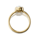 This Allie rendition centers a beautifully chunky true antique old mine cut diamond. Set in a golden collet setting that mixes antique and modern themes for a timeless look