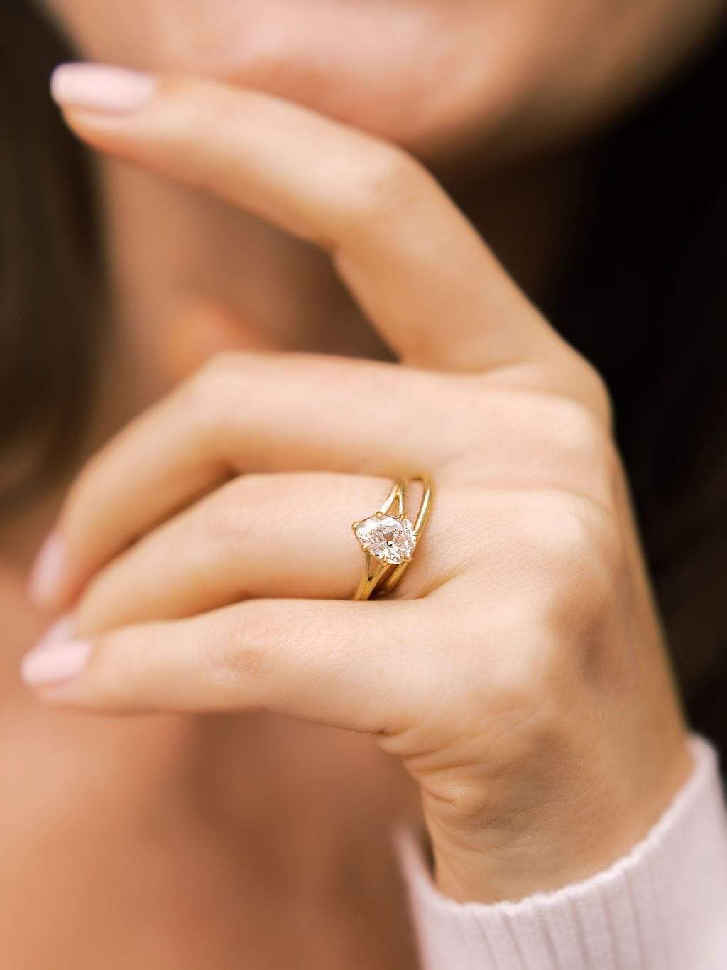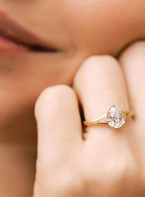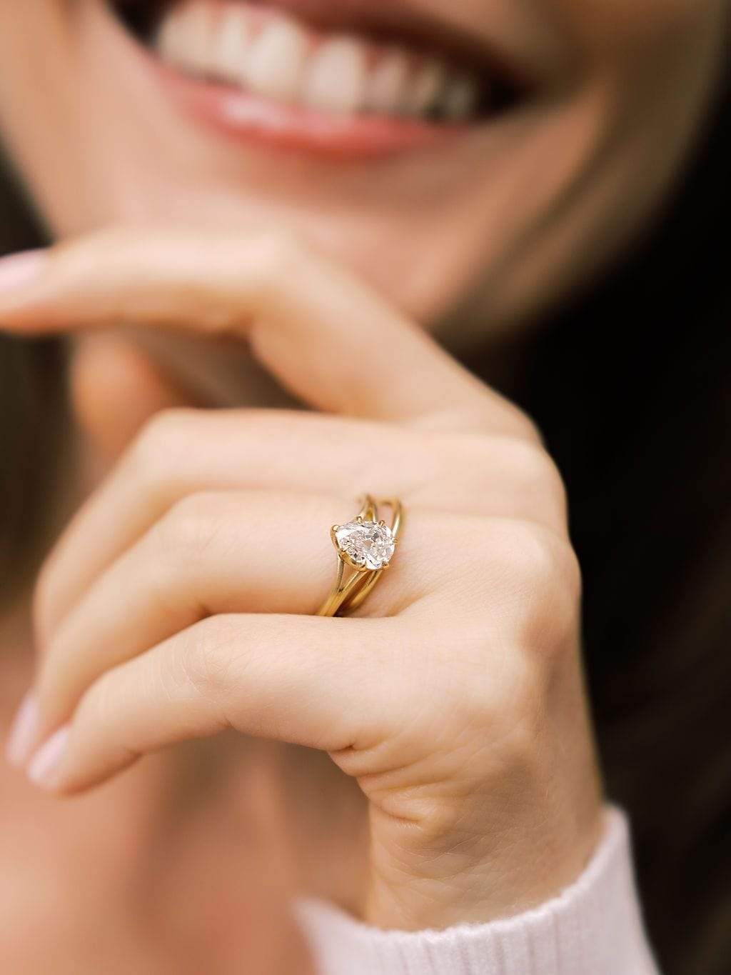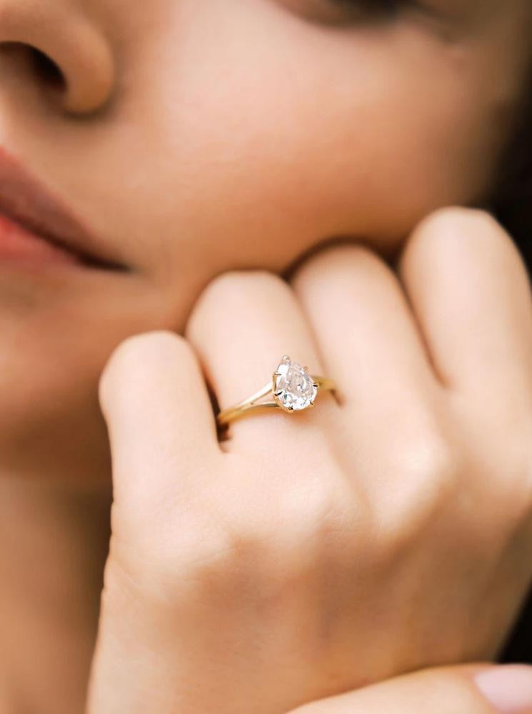 We love the simplicity of a gorgeous bright diamond on a yellow gold band. The pear diamond is beautiful with classic antique faceting.