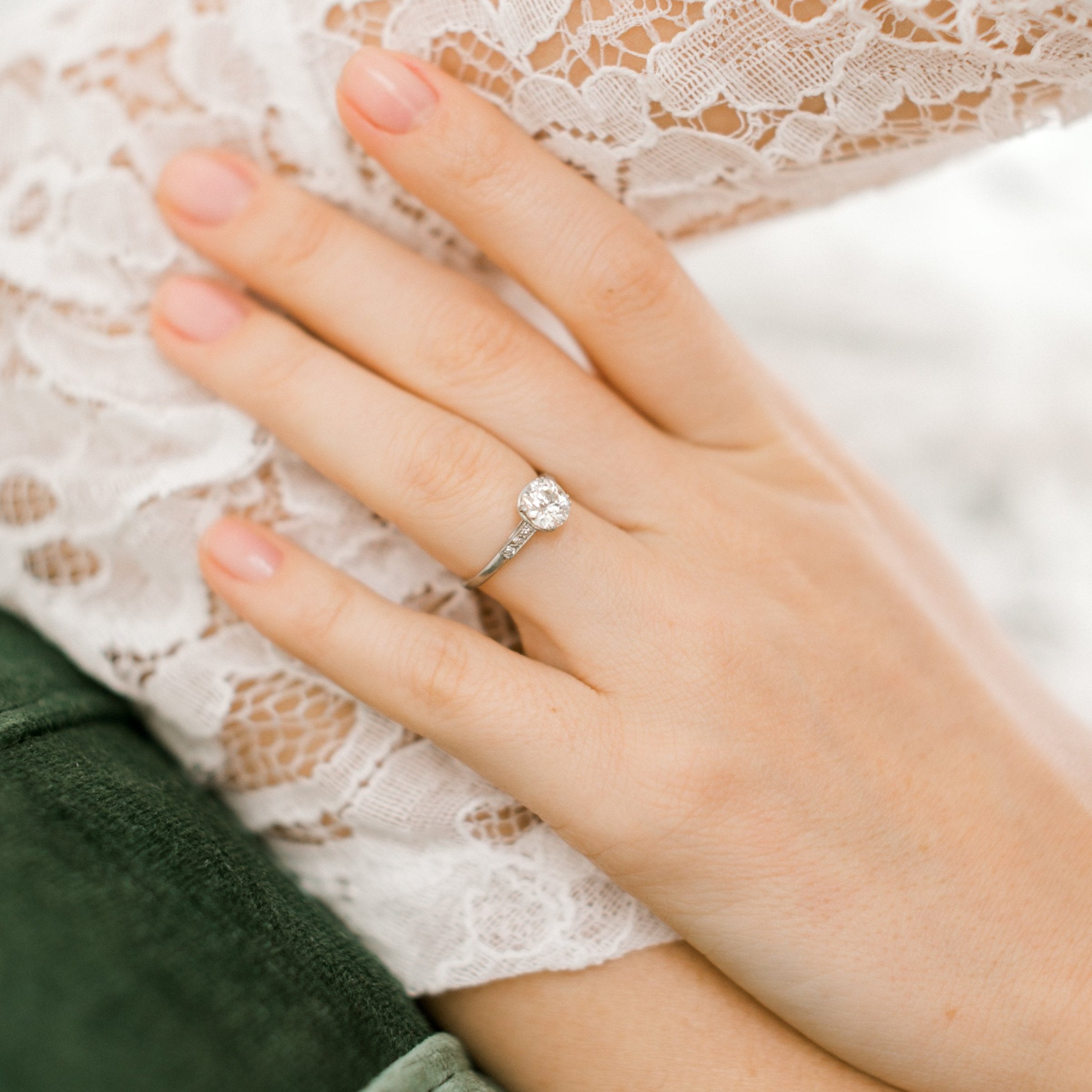 Classically beautiful! The diamond is incredibly bright and beautiful with 4 very minimal prongs that allow all the light to get in and out of the diamond! The side diamonds add just a touch of extra sparkle!