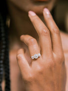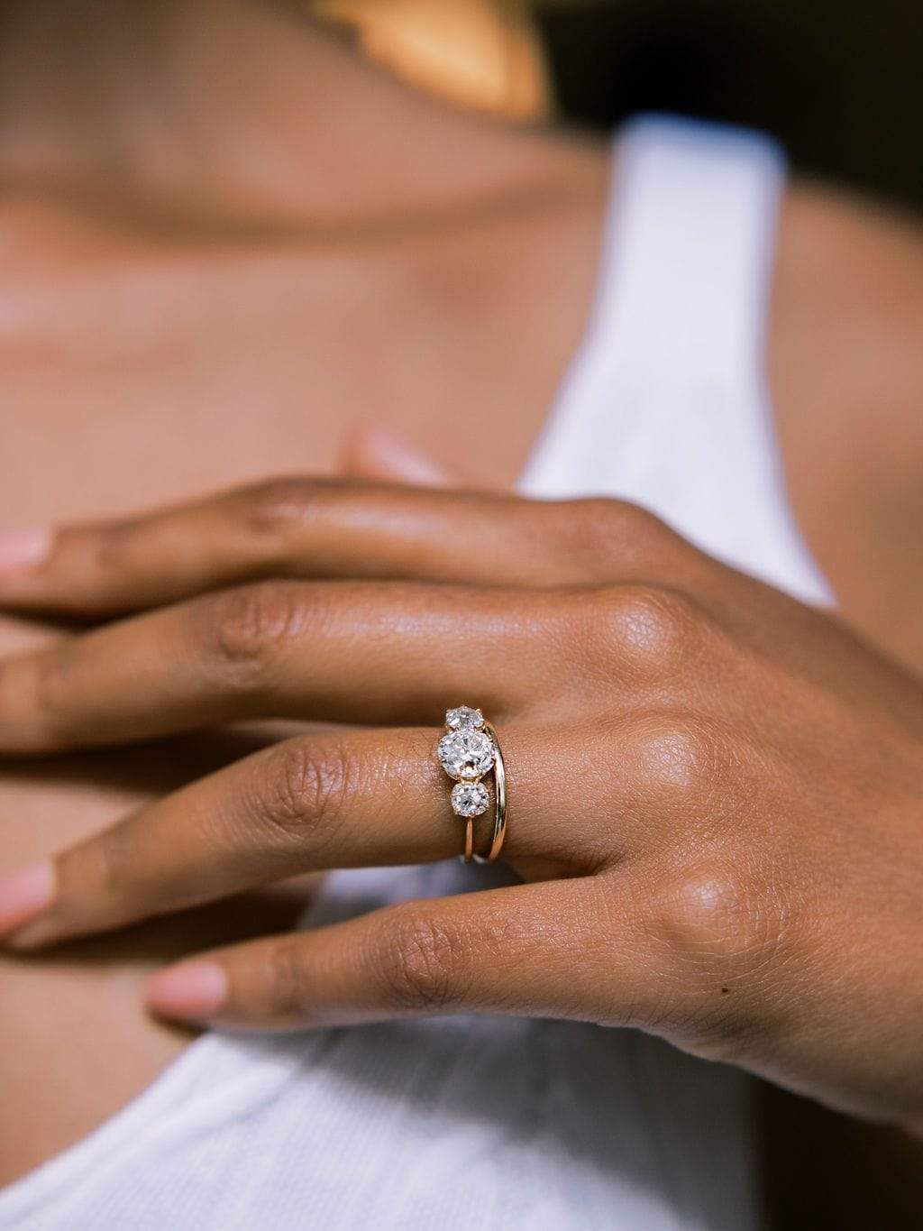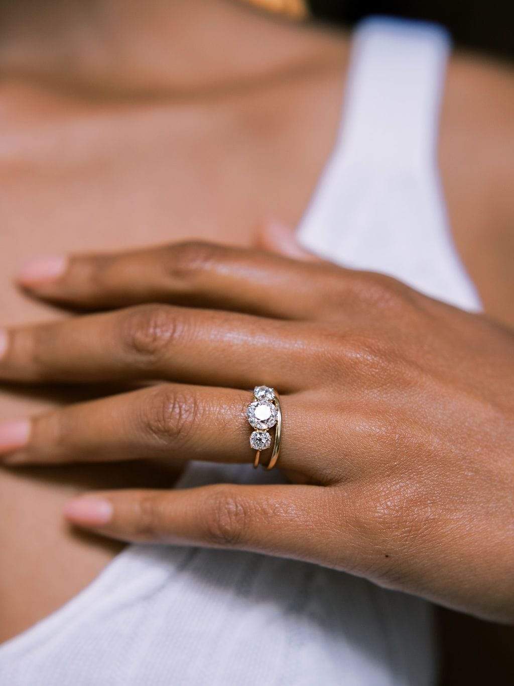 This Marielle ring features some gorgeous stones that span the finger in a delicately beautiful setting. The center stone has a hybrid old mine-old European cut look and is brilliantly bright with perfectly complementing side stones.