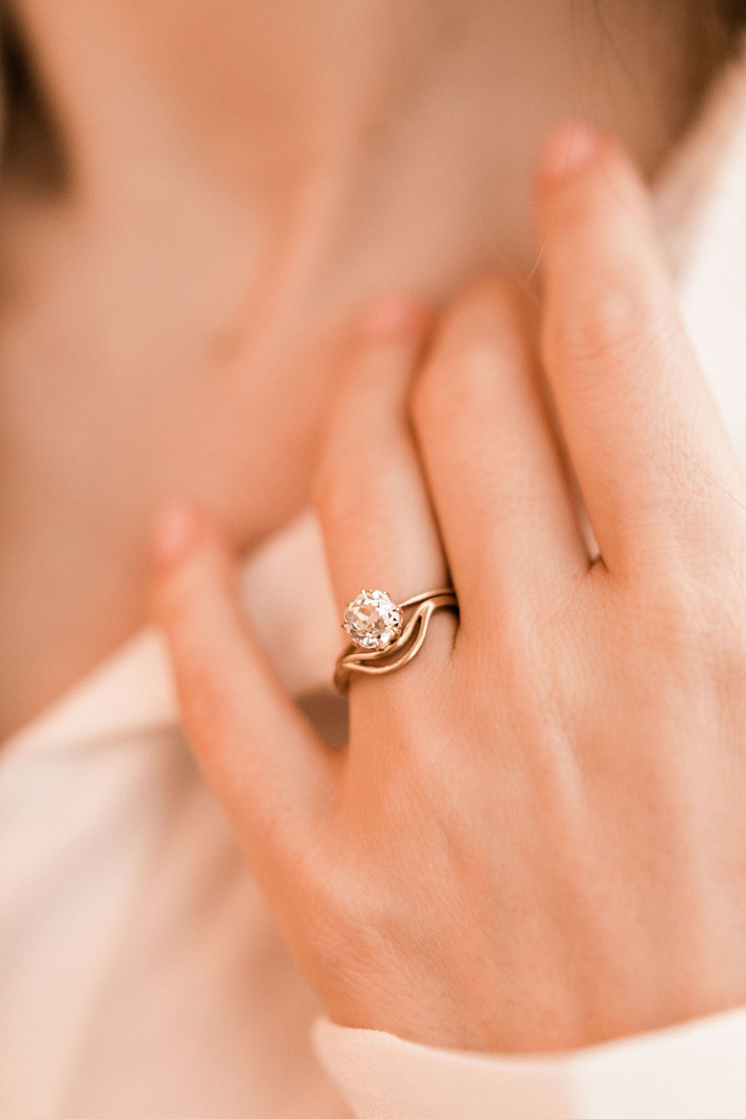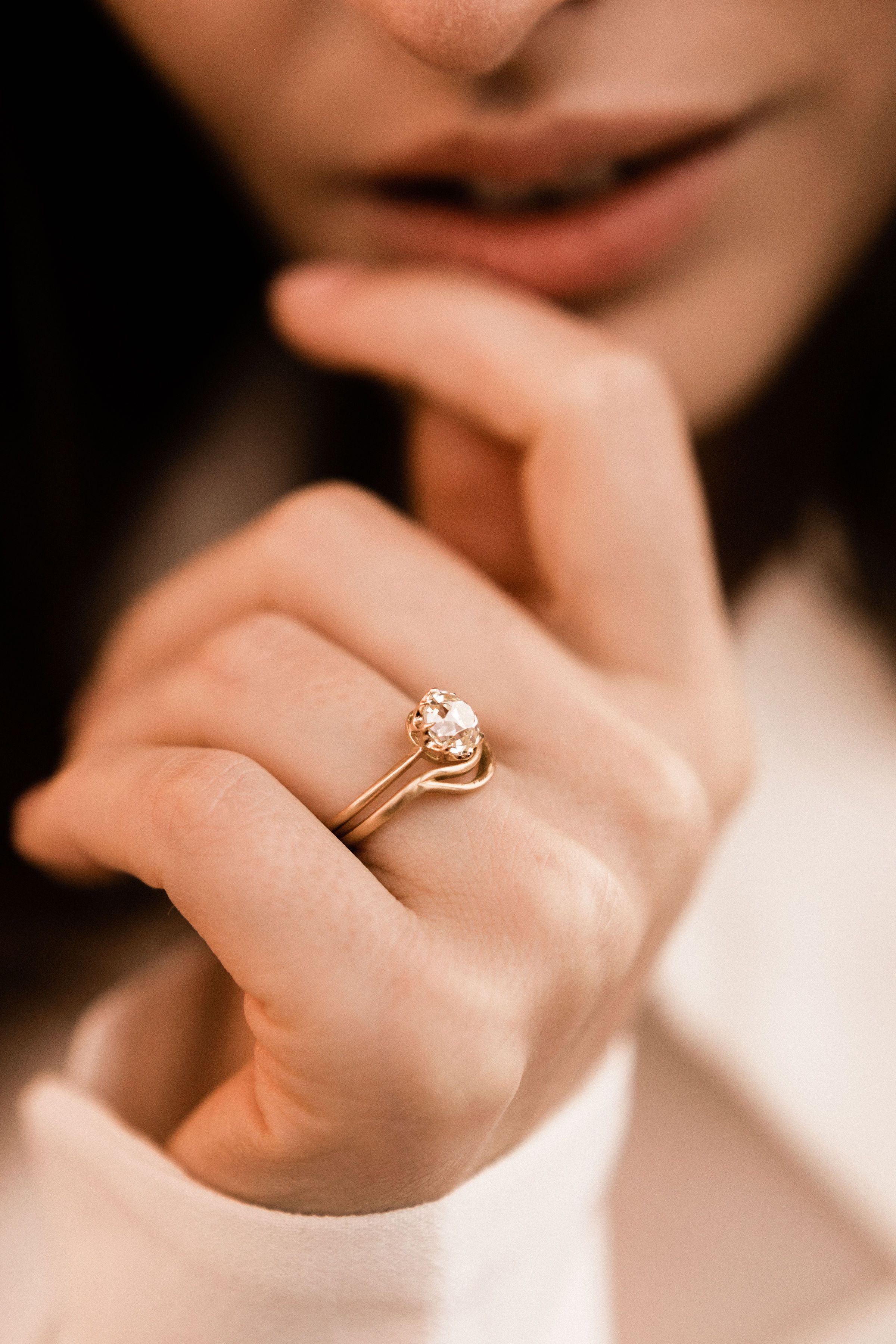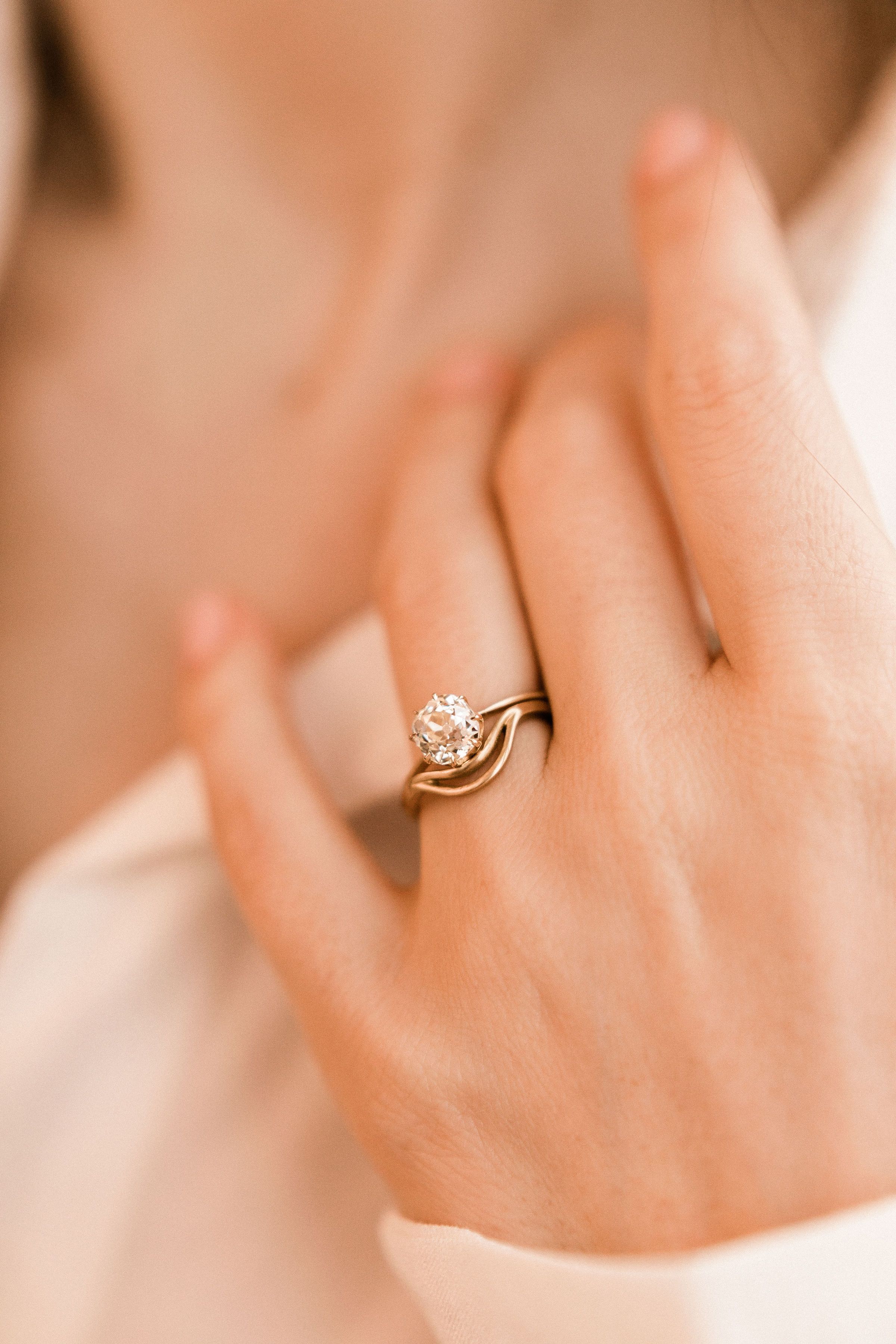 A gorgeous, chunky old mine cut diamond centers this ring! The setting is delicate and simple and endlessly stackable! Set low and pairs perfectly with The Perfect Band!