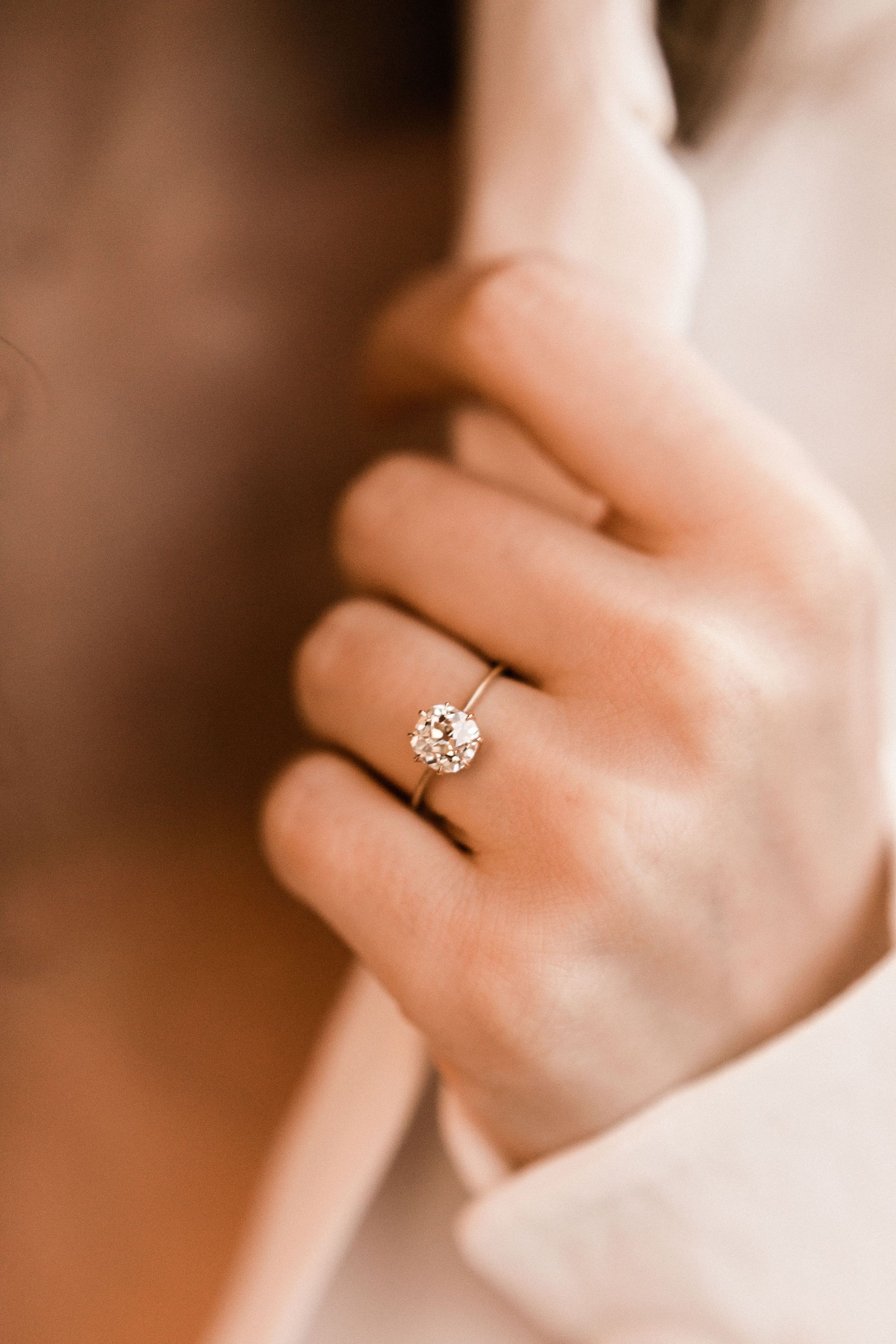 Bella 1.62 ring is a VB-made engagement ring centering an authentically antique diamonds! This 18k Yellow Gold Solitaire Engagement Ring centers a GIA Certified 1.62 carat old mine cut diamond of N color, VS1 clarity. It is set in an 8 prong 18kt yellow gold setting with a lightly tapered shank. The ring is currently size 6.25 can be resized!