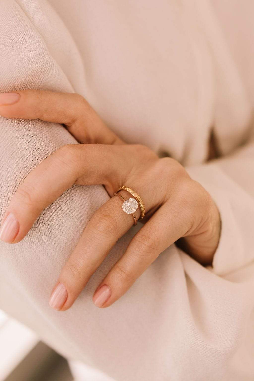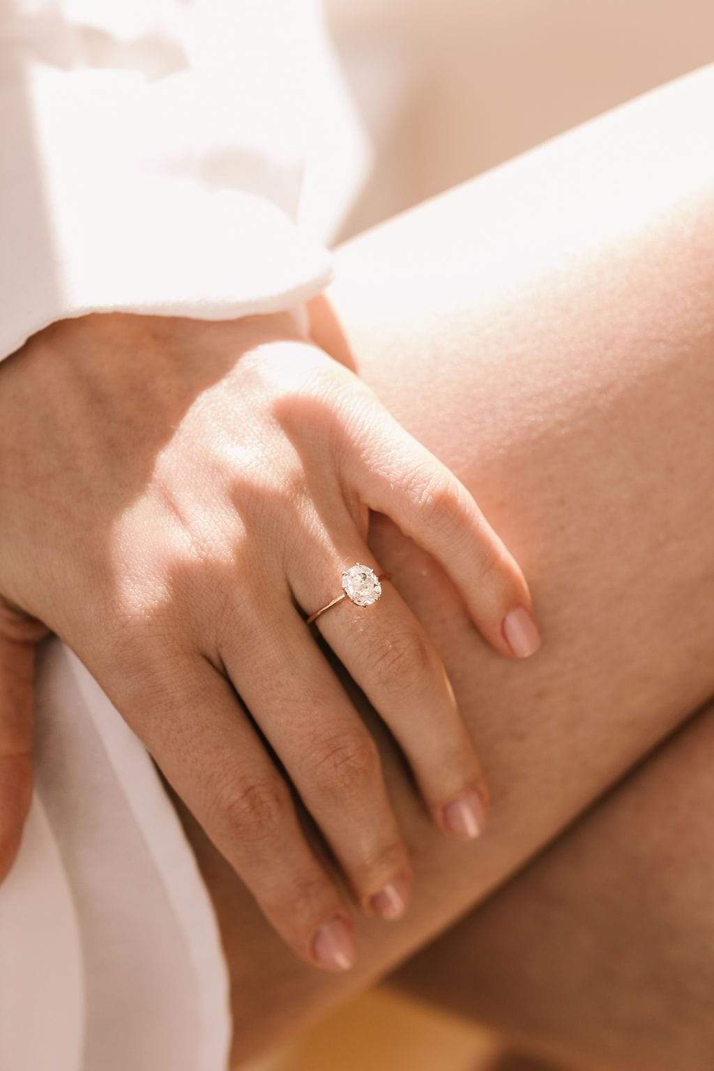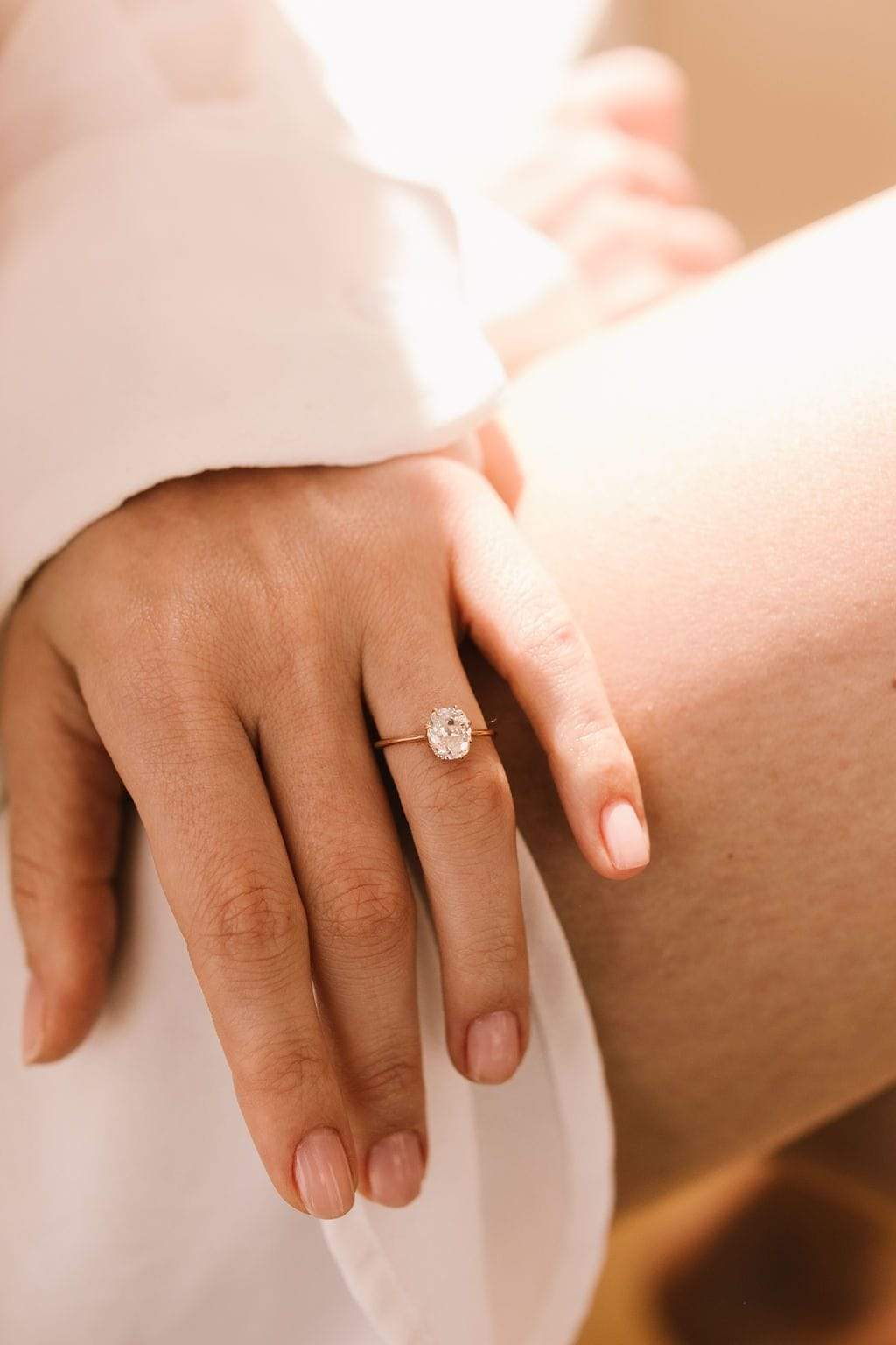 The diamond in this ring has that perfect elongated cushion shape in a bright color against the lovely hue of the rose gold!