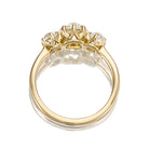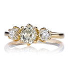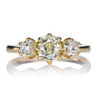 The Marielle 1.03 ring is an AB original design made right here in NYC. The ring centers a GIA-certified 1.03 carat Old Mine Cut diamond of K color, SI1 clarity. Set to each side of the center stone is one Old Mine Cut diamond, both combining for a total of 0.71 carats of coordinating color and clarity. The three stones are set in an 18kt Yellow Gold prong setting. The ring is currently size 6 and can be resized!