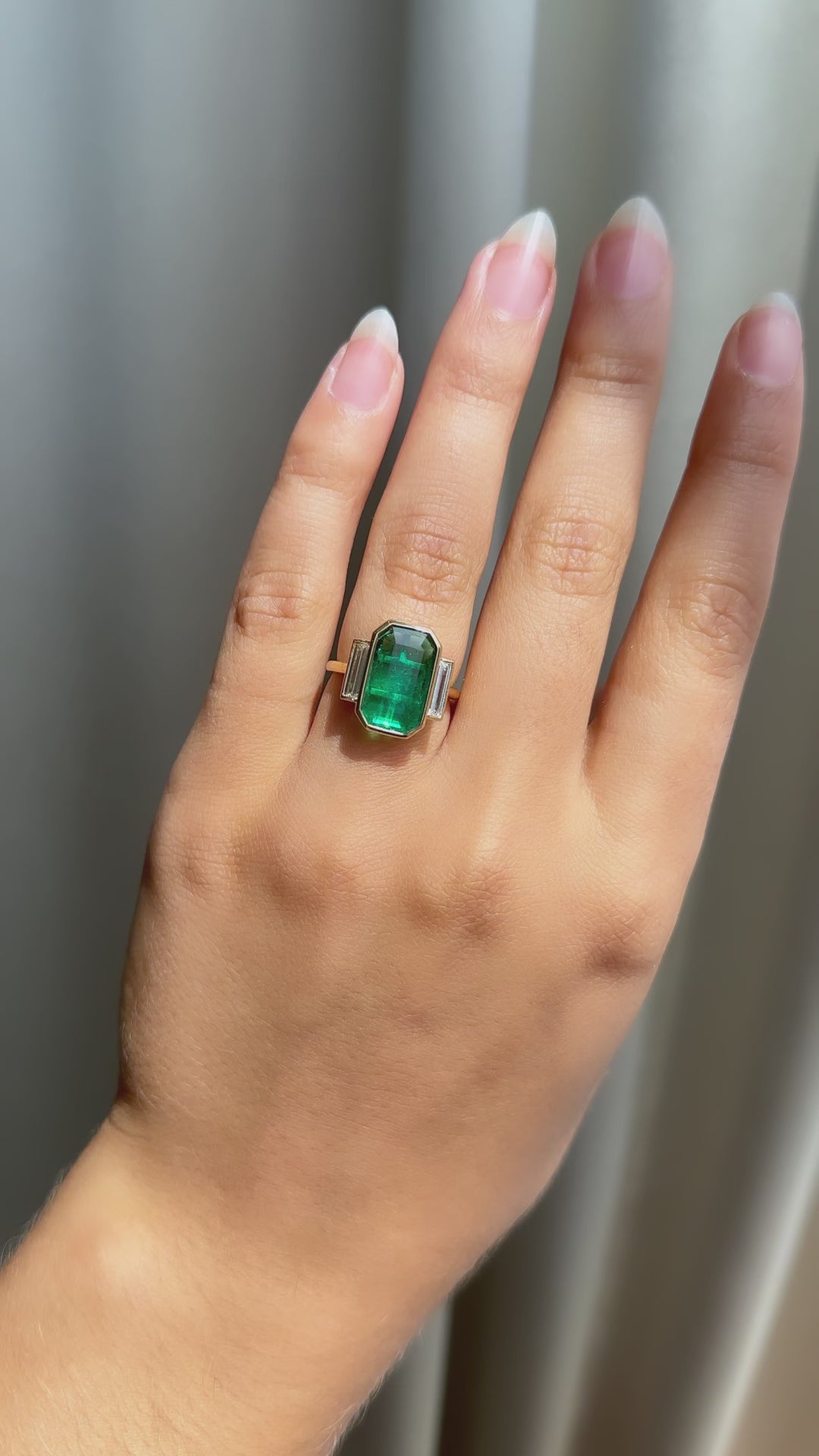 The Remmy 2.24 ring is an AB original design made right here in NYC. The ring centers a GIA-certified 2.24-carat octagonal cut Colombian Emerald of moderate clarity enhancement. The stone is bezel set in an 18kt yellow gold setting with a vertical baguette set to either side combining for 0.35-carats. The ring is currently sized slightly over a 5.75 and can be resized!