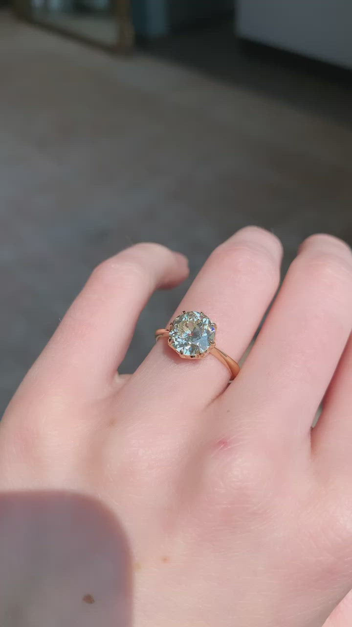 This ring is all about the center stone, and for a good reason. The center stone has beautiful facets that we love to see in our old cut diamonds which makes it bright and fiery.