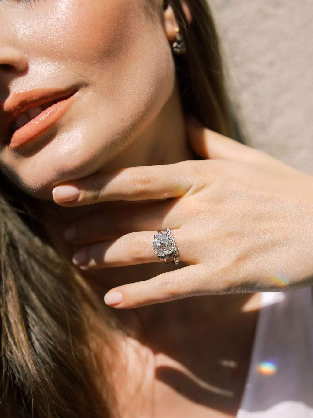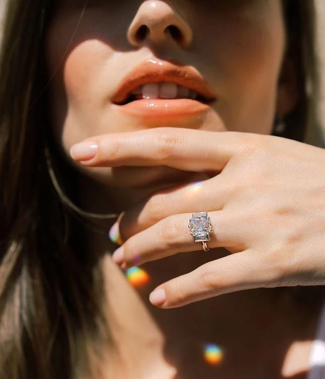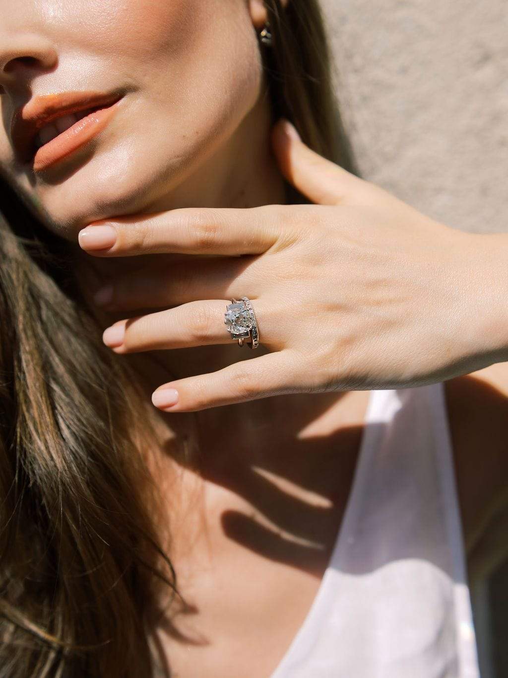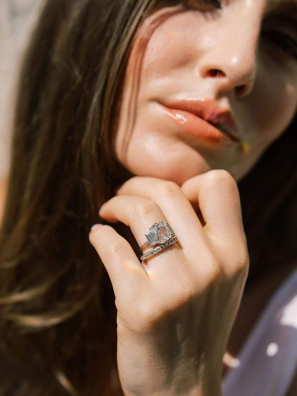 This ring was styled after the gorgeous Petra original art deco ring! We fell in love with this center stone and we wanted to put it in a setting that really emphasized its beauty. The diamond is a bit more spread out with these gorgeous, broad facets that just shimmer. We felt these sleek baguettes with complement the stone perfectly!