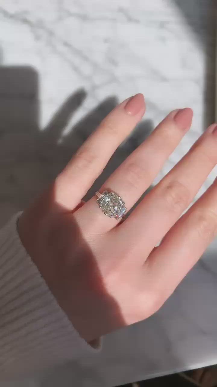 The Petra 2.49 ring is a vintage-inspired VB-made diamond engagement ring. The ring centers a GIA certified 2.49 carat old mine cut diamond of I color, VS1 clarity. The diamond is set in a 6 prong platinum setting with a vertically-set diamond baguette to each side. The stones are of approximately H-I color, VS clarity and combine for a total of 0.38 carats! The ring is currently size 6 and can be resized!