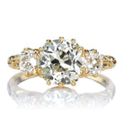 The Leander 2.52 ring is an AB original design made right here in NYC. The ring centers a GIA-certified 2.52-carat Old Mine Cut diamond of N color, VS2 clarity. An Old Mine Cut diamond is set to either side of the center stone, both combining for 0.83-carats and of approximately L-M color, VS clarity. The stone is set in a fourteen-prong 18kt yellow gold setting. The ring is currently size 6.75 and can be resized!