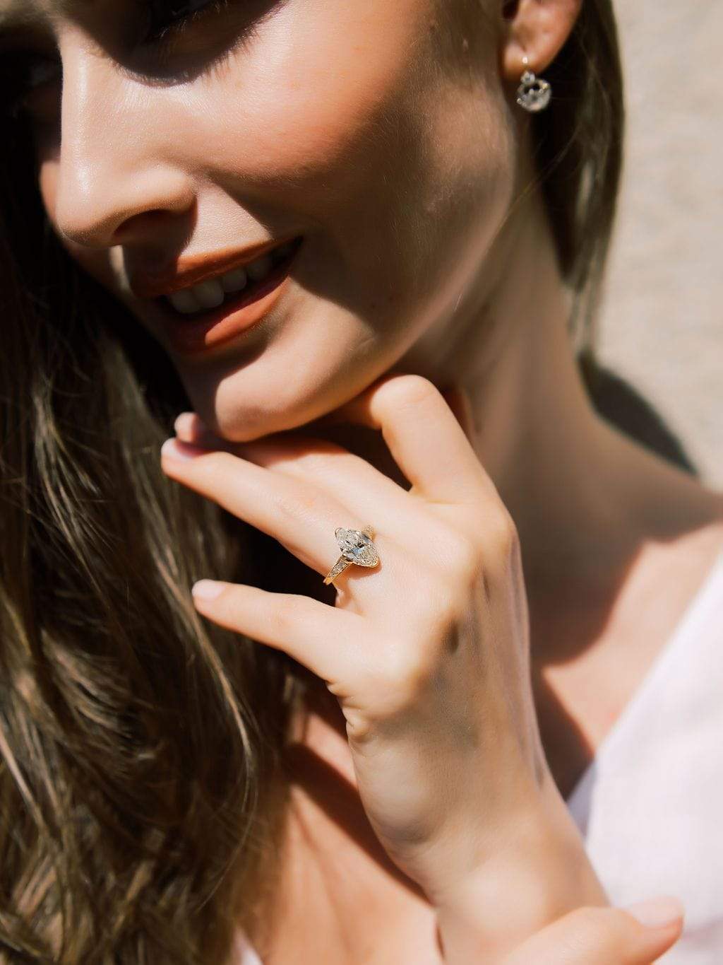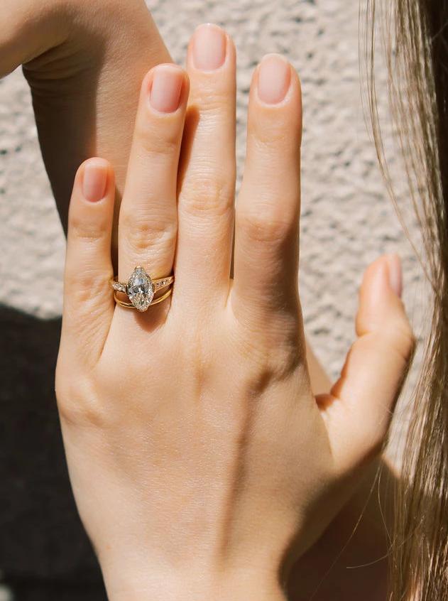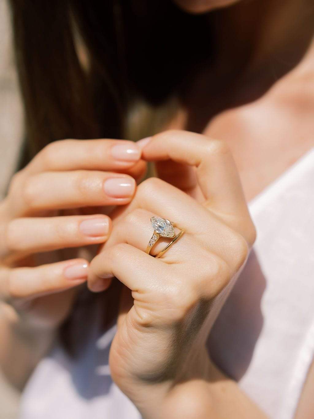 The diamond in this ring has such a gorgeous shape! A "chubbier" marquise that is more "Moval" and very beautiful. It is set simply in a golden setting with a low-profile and cute antique diamonds to each side.