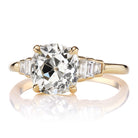The Emilia 2.67 ring is an AB original design made right here in NYC. The ring centers a GIA-certified 2.67-carat Old Mine Cut diamond of N color, VS2 clarity. The stone is set in a 4-prong 18kt yellow gold setting with three step-down baguettes channel-set to either side of the center stone. The ring is currently size 6 and can be resized!