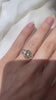 The ever-sought-after antique Oval Cut makes an incredible appearance in this three-stone beauty. With its enchanting shade of champagne and dream elongation, and perfectly framed by coordinating side stones, this one is a dream. Subtle ridging along the bands adds just the right touch of vintage-inspired charm.