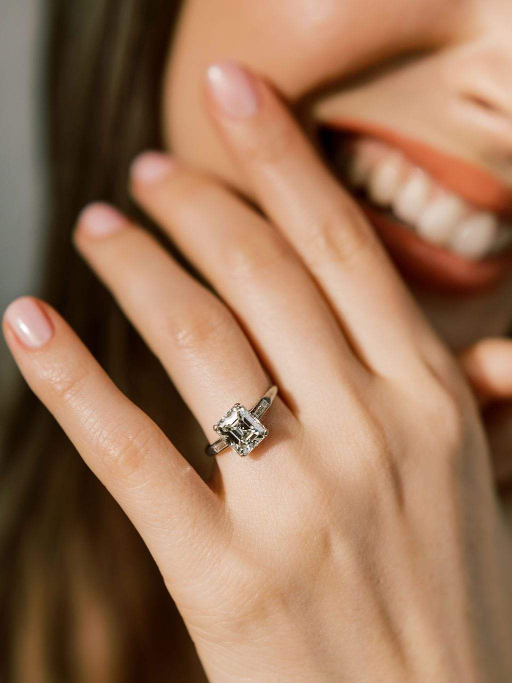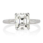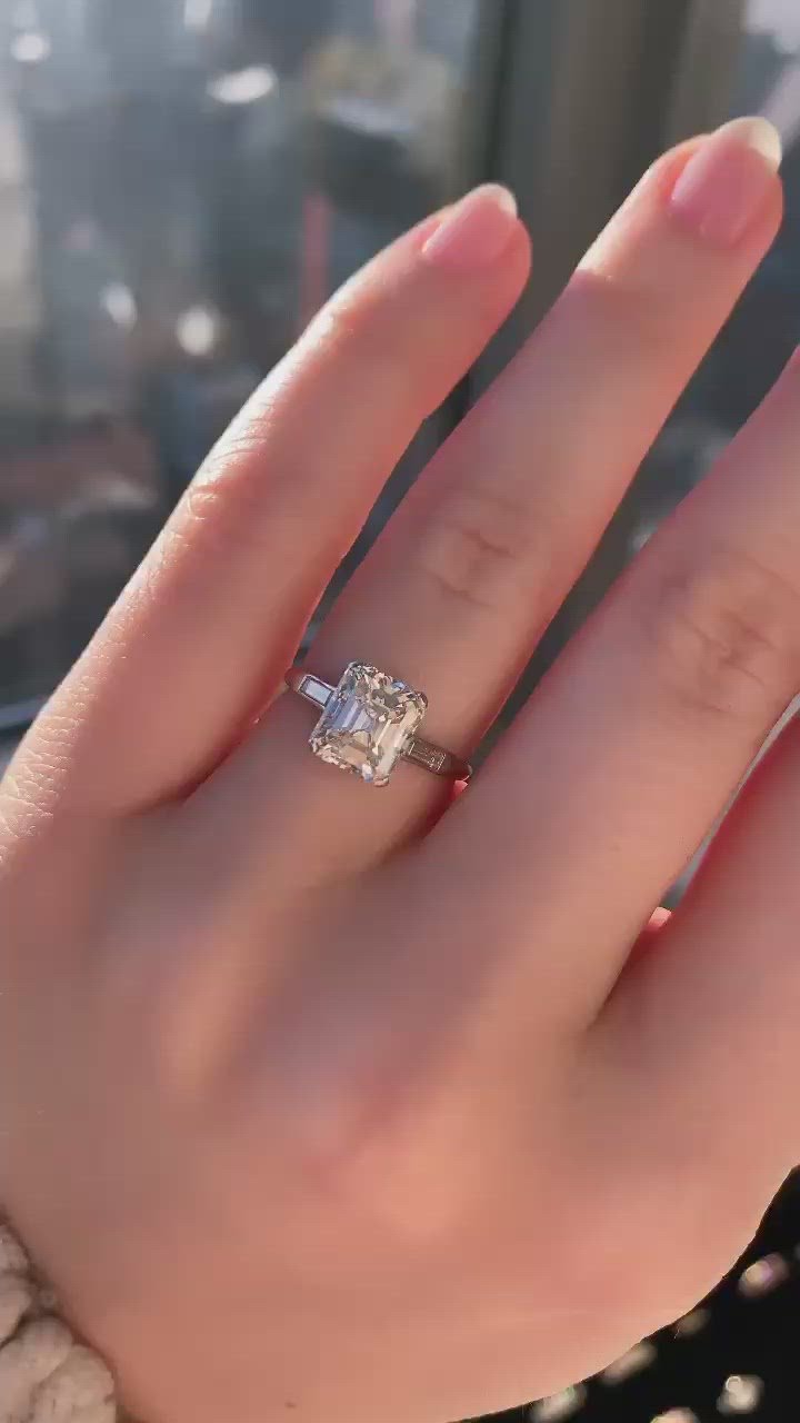 The Kenny ring is a vintage diamond engagement ring from the Art Deco Era. The ring centers a GIA certified 2.80-carat Asscher cut diamond of K color, VS2 clarity. The stone is set in a 4 prong platinum setting with a sleek baguette to each side. The ring is currently size 6.25 and can be resized!
