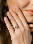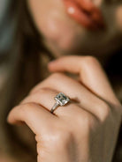 The center stone measures 8.37 x 7.22 x 5.28 mm.