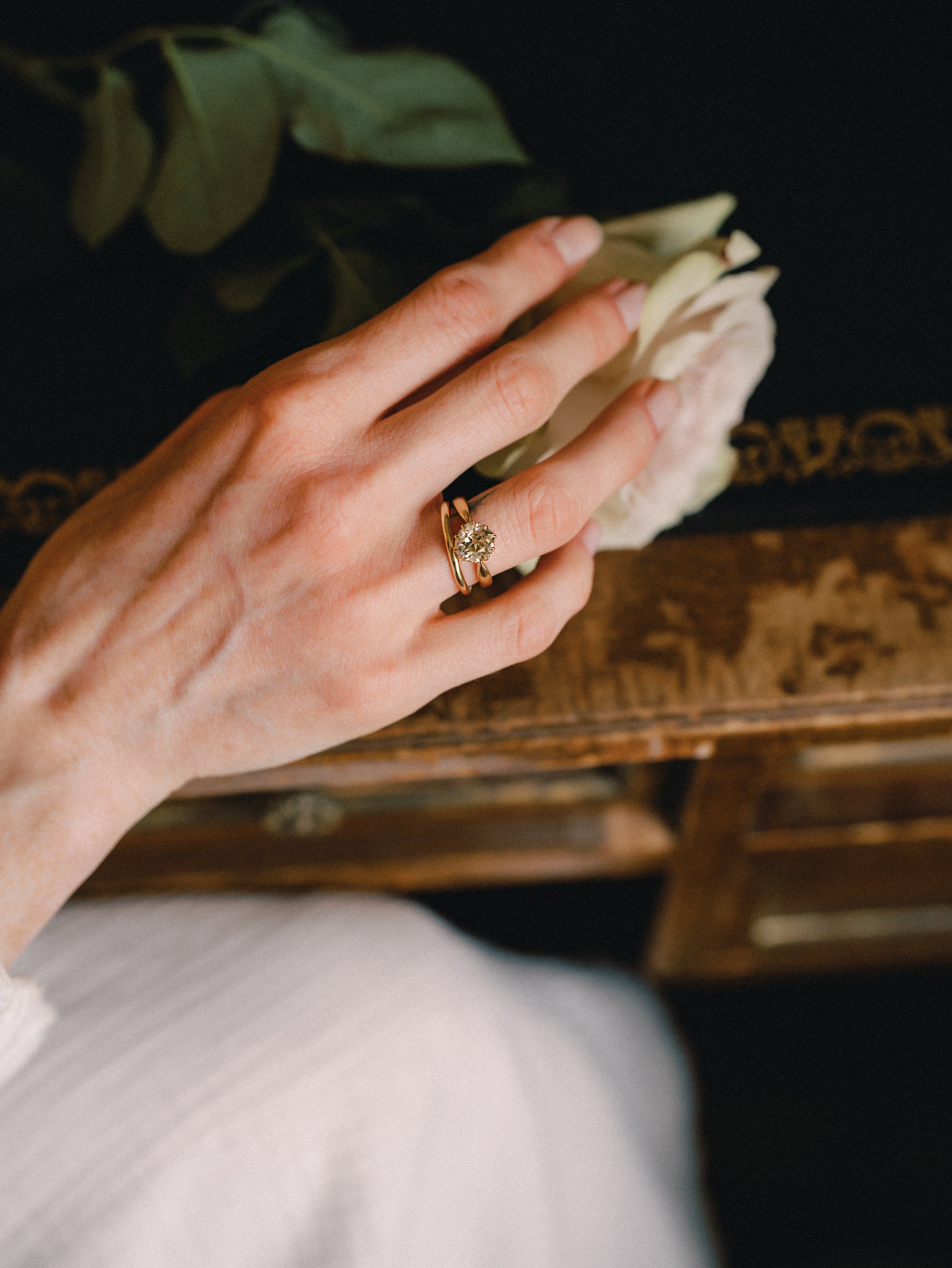 We adore this beautiful and unusual stone with its slight kite outline, gorgeous Champagne hue, and dreamy faceting pattern. Set in our beloved Julian setting which is a timeless style with antique flourishes in the multi-prongs and chunky, tapered shank.