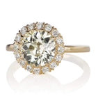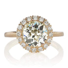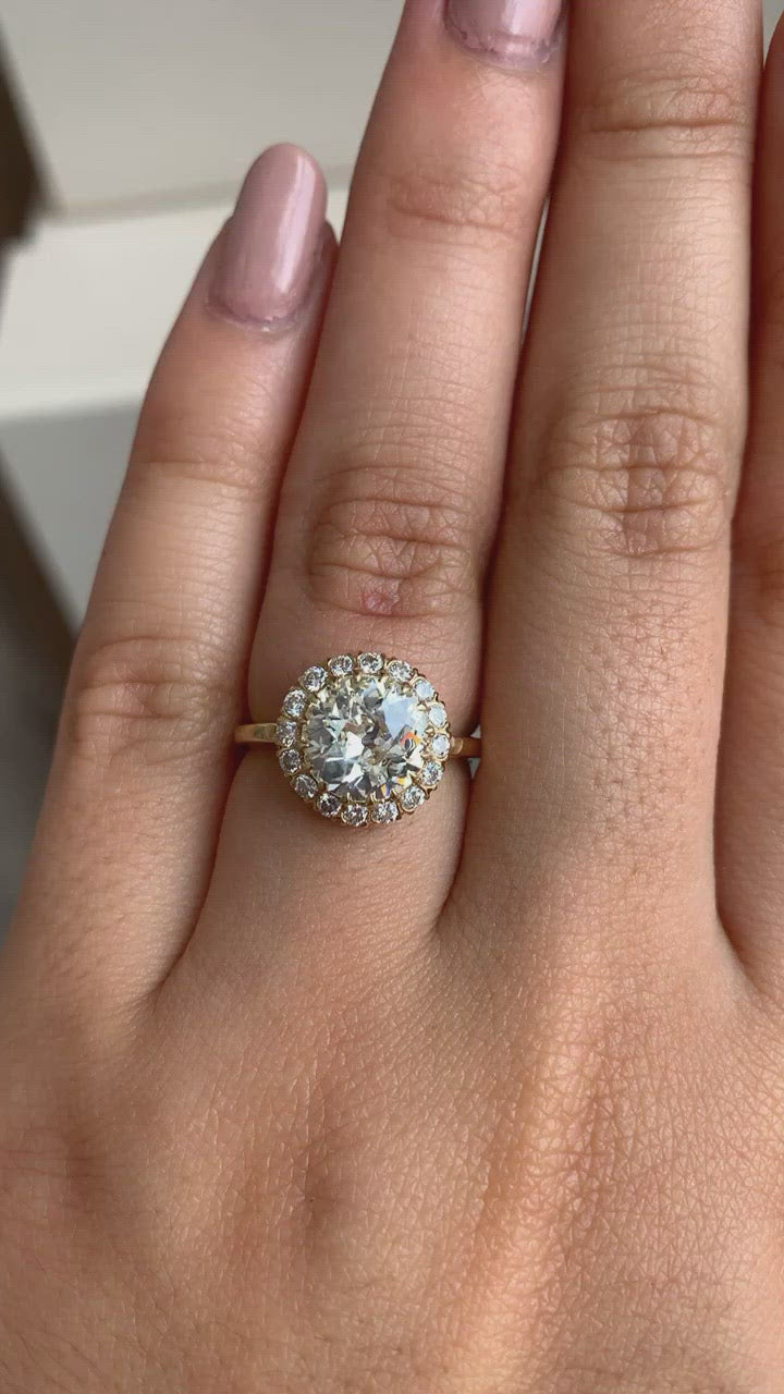The Helene ring is a newly-made cluster-style ring centering a gorgeous antique diamond. The ring centers a GIA certified 2.08-carat old European cut diamond of Q-R color, SI2 clarity. The stone is set in a yellow gold setting. Sixteen round diamonds are set into a gold halo surrounding the center stone. The Halo stones combine for 0.16 carats. The ring is currently size 5.5 and can be resized!