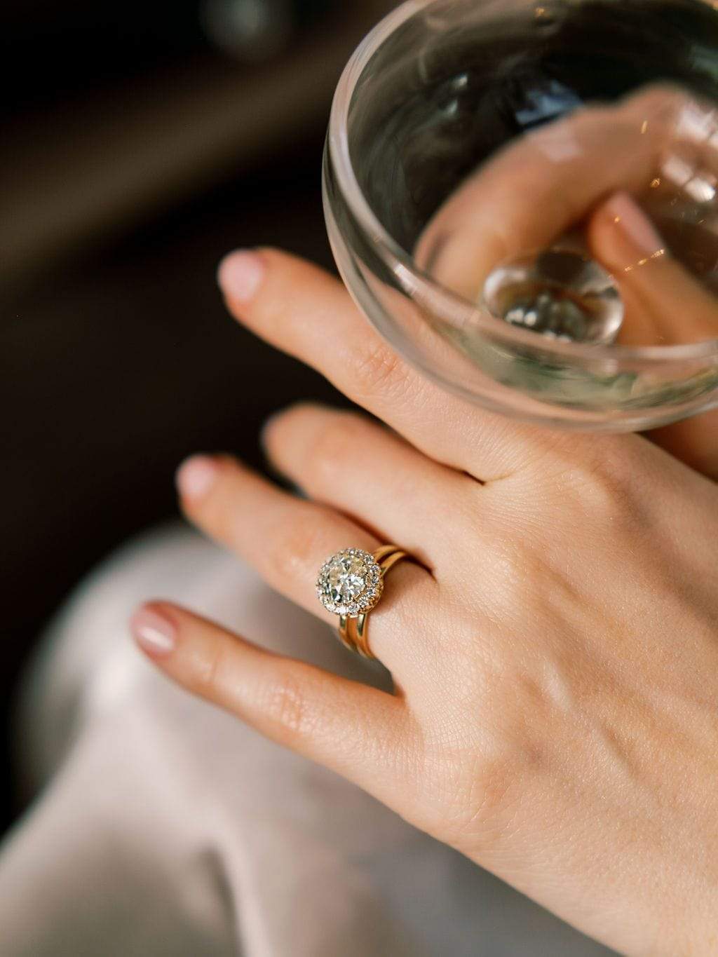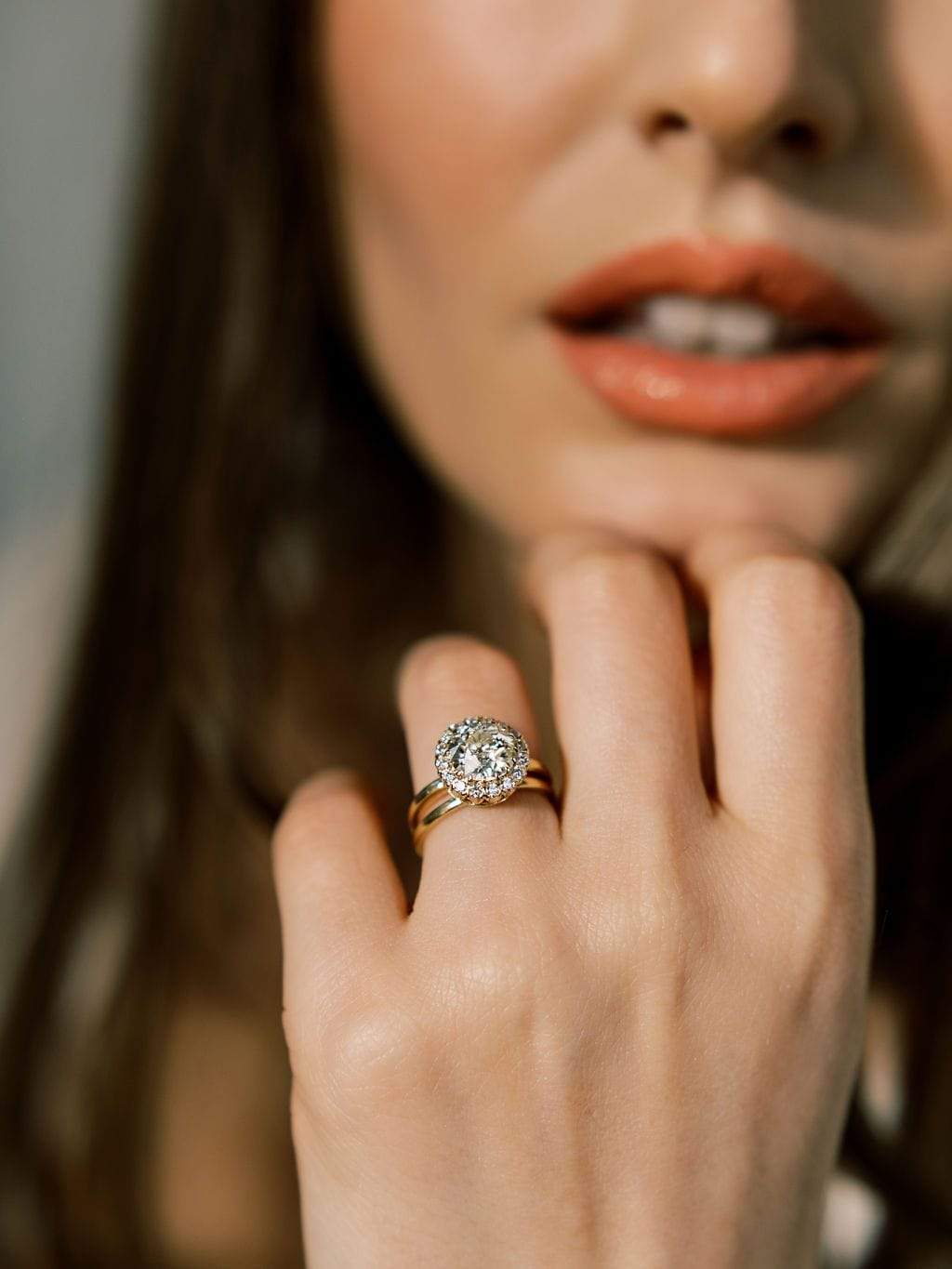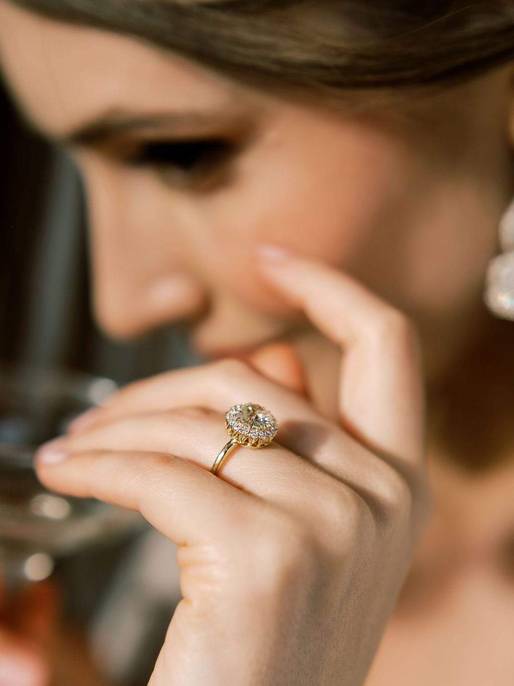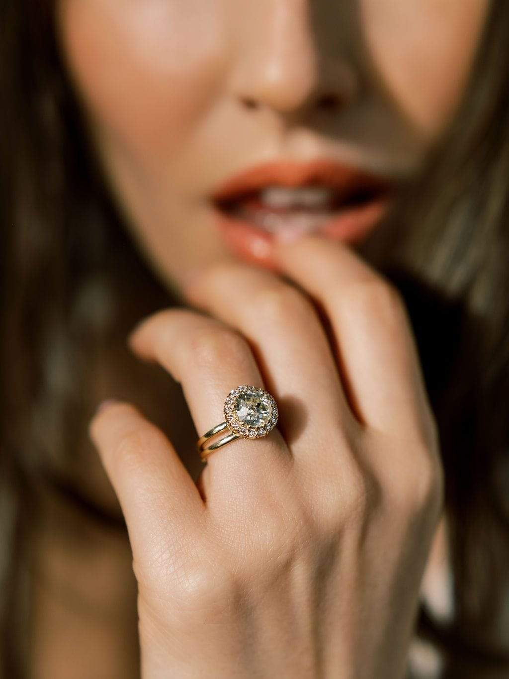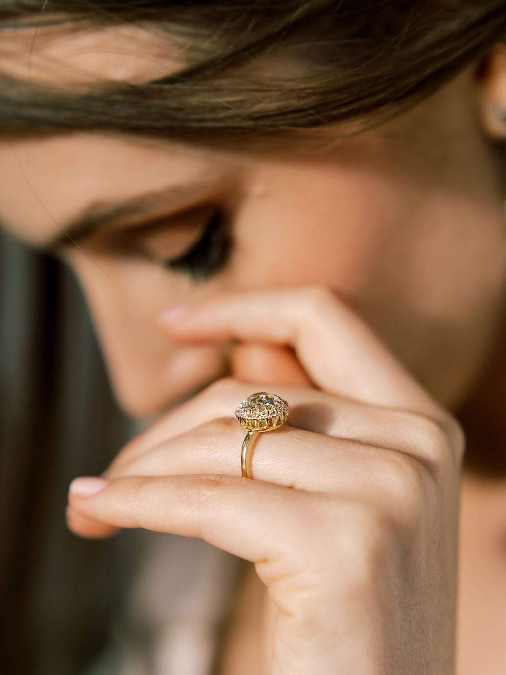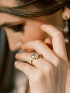 These cluster-style rings are always a dream! This golden ring centers a beautiful antique diamond with a crisp halo adding some extra shine and extra size!