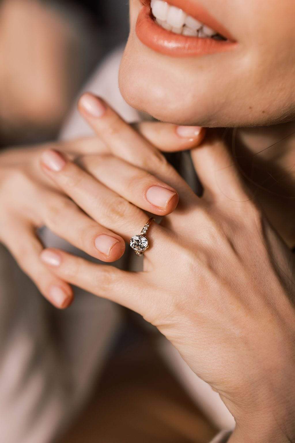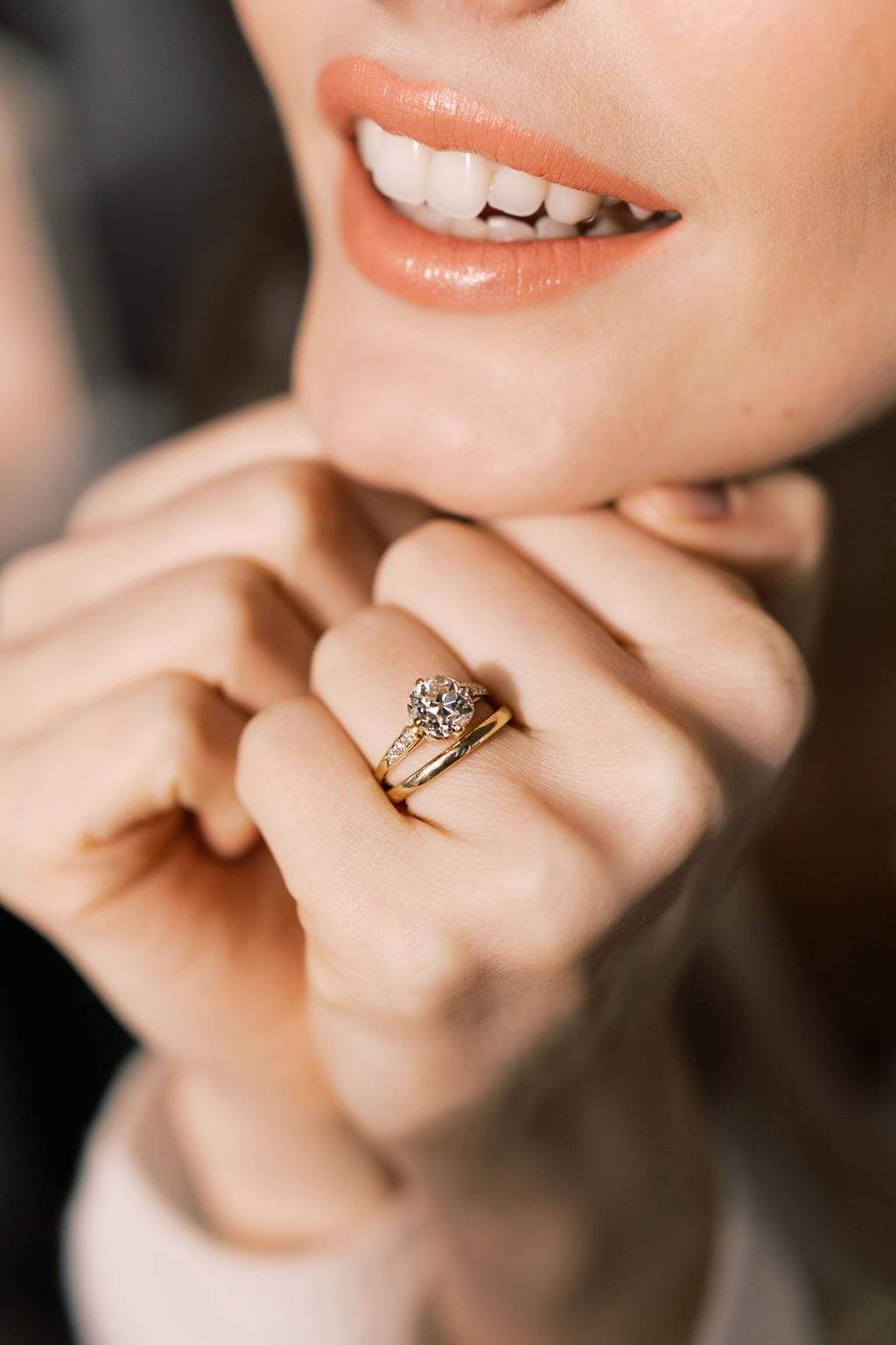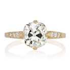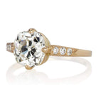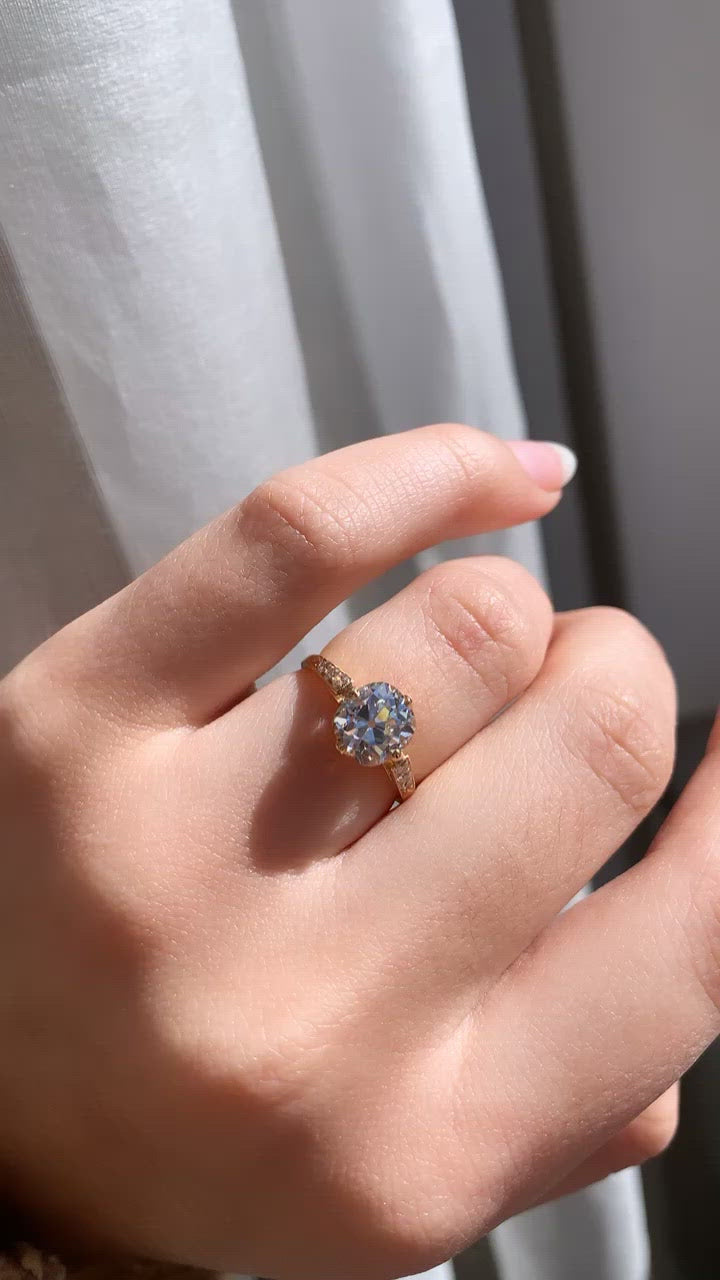 The Rosaria 2.08 ring is a vintage-inspired VB-made diamond engagement ring. The ring centers a GIA certified 2.08-carat old mine cut diamond of J color, SI1 clarity. The diamond is set in a 4-prong 18 karat yellow gold setting. To each side are 3 old European cut diamonds bead-set in the shoulders. The ring is currently size 6 and can be resized!