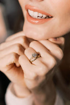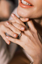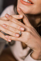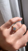 We love the Rosaria setting for its strong attention to a gorgeous center stone and the clean lines it has. This center stone is the dream shape of old mine cut with a slight elongation and the perfect "chunkiness." The four prongs are set in the N-E-S-W orientation and provide a sleek look with just a bit of extra glam from the side OECs. Always a sell-out stunner!