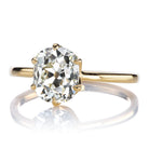 Elongated Old Mine Cut perfection! This diamond features chunky faceting and a vibrant look. Set in a timeless solitaire setting that can be stacked with bands and styles to your own personal tastes.