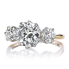 The Marielle 2.04 ring is an AB original design made right here in NYC. The ring centers a GIA-certified 2.04 carat Old Mine Cut diamond of J color, VS2 clarity. To either side of the center stone is an old European cut diamond, both combining for a total of 0.80 carats of coordinating color and clarity. The stones are prong set in platinum prongs atop an 18kt yellow gold base. The ring is currently size 6+ and can be resized!