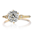 The Alva 2.02 ring is a VB original made right here in NYC. The ring centers a GIA-certified 2.02-carat Old Mine Cut diamond of K color, I2 clarity. The stone is set in a 6-prong 18kt yellow gold setting with leaf-like shoulders set with an European old cut diamond in the center. The ring is currently size 6 and can be resized!