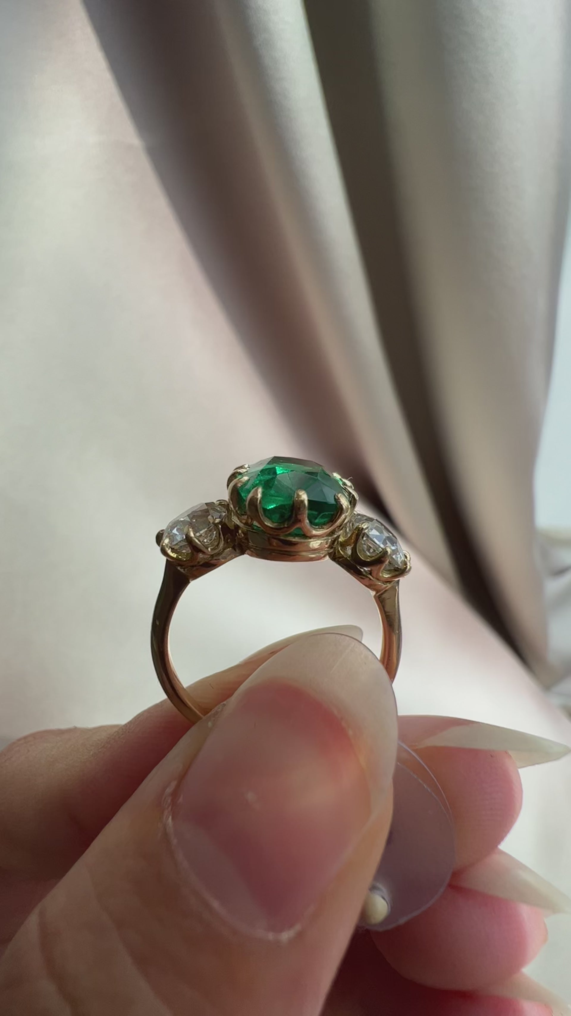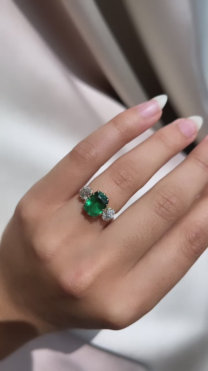 The Mallory 3.18 ring is a VB original design made right here in NYC. The ring centers a C Dunaigre-certified 3.18-carat cushion cut Zambian emerald of moderate clarity enhancement. The stone is set in a 12 prong 18kt yellow gold setting with an old mine cut diamond of approximately I-J color, VS-SI clarity combining for 1.48-carats set to either side of the center stone. The ring is currently size 6 and can be resized!