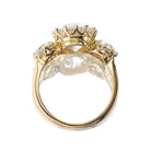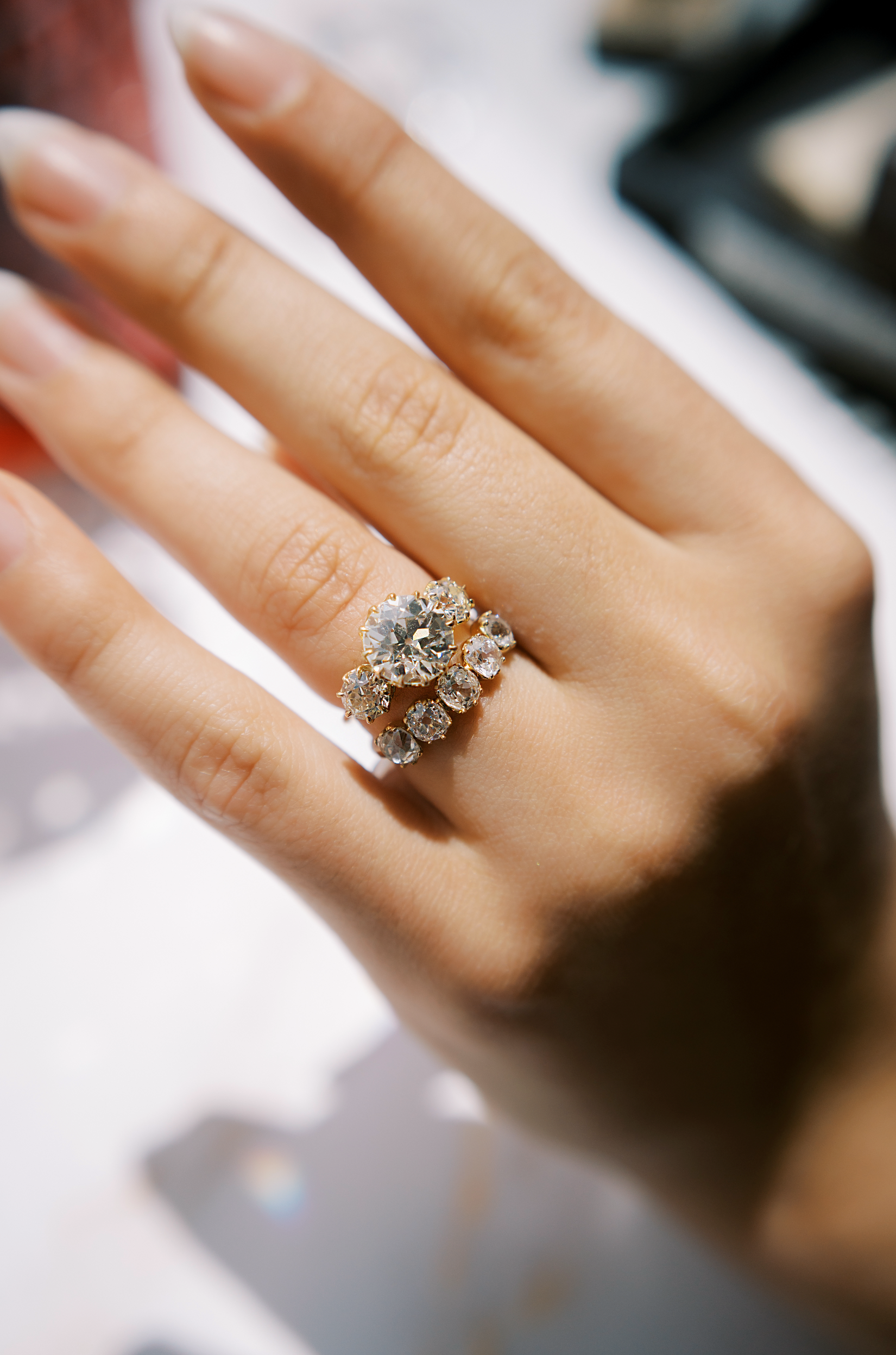 The Marielle 3.35 ring is a VB original design made right here in NYC. The ring centers a GIA-certified 3.35-carat old European cut diamond of M color, VS1 clarity. An old European cut diamond of coordinating color and clarity is set to either side of the center stone combining for 1.15-carats. The stone is set in a 12-prong 18kt yellow gold setting. The ring is currently size 6 and can be resized!