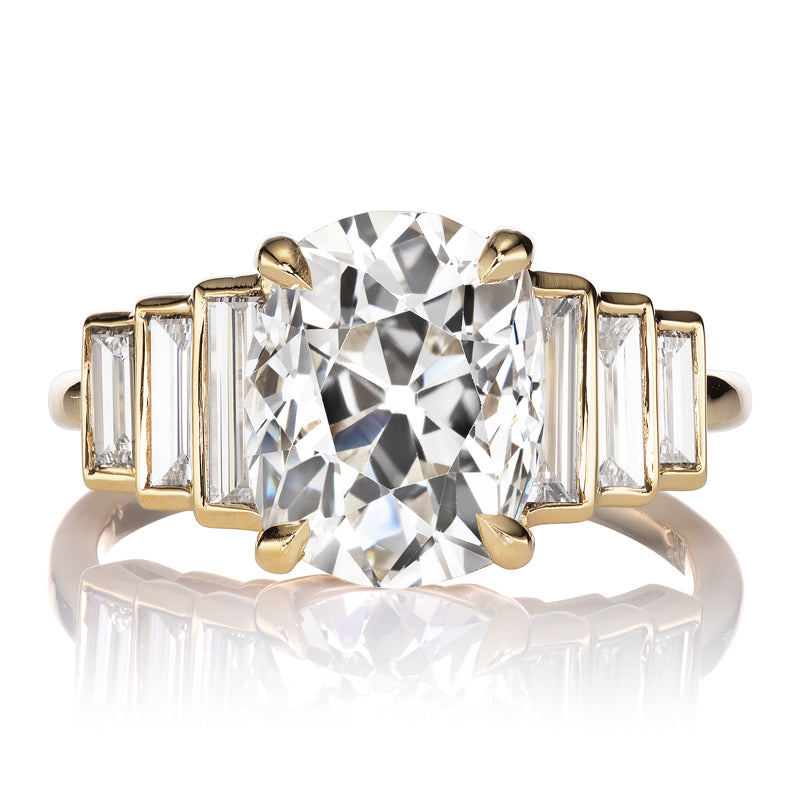 3.5 Carat Rare Elongated Old Mine Cut Diamond with Baguette Side Stones