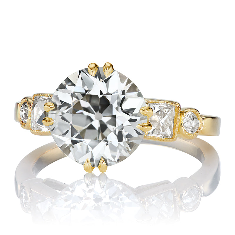 The Paloma 3.67 ring is an AB original made right here in NYC. The ring centers a GIA-certified 3.67-carat old European cut diamond of M color, VS2 clarity. The stone is set in an 18kt yellow gold setting. A Bezel-set French cut and old European cut diamond are set into each shoulder and 4 additional old European cut diamonds are set into the gallery of the ring. The ring is currently size 6 and can be resized!