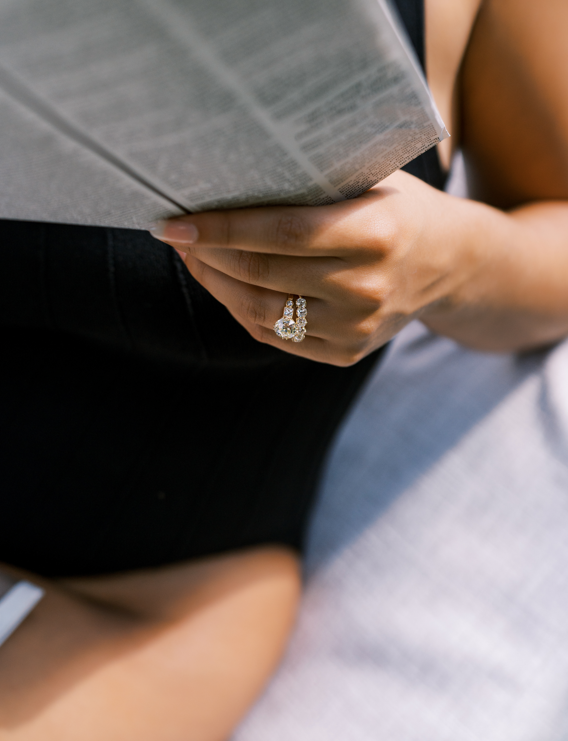 One of our favorite styles for its play of unique shapes. We chose an absolutely stunning center stone for this dream ring that shines from a mile away. Beautiful side stones provide dimension and finger span.