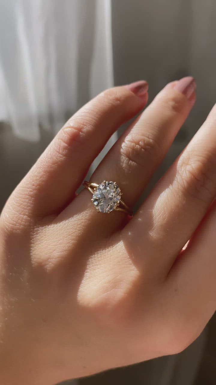 This diamond is a beautiful and rare find! Antique Ovals are not the most common shape and this one has a beautiful shape and amazing antique faceting. We set it in a gorgeous golden setting that draws the eye to the amazing stone.