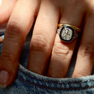 Featuring an over three-carat Old Mine Cut with kaleidoscope faceting and the open culet we adore, the Moya ring's central diamond is accented by a halo of calibré cut onyx. The piece's smooth Platinum bezels lend chic modernism to this century-old ring, while the scrolling metalwork of Moya's gallery adds a touch of whimsy and femininity. A unique and visually impactful piece.