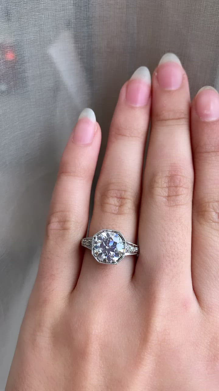The Shauna Ring is an authentic Art Deco Era Engagement Ring. The ring centers a GIA Certified 3.01 carat Transitional Cut diamond of J color, VS1 clarity. The diamond is set in an octagonal platinum setting with three old European cut diamonds lining each shoulder. The gallery has extraordinary filigree work. The ring is size 7.25 and can be resized!