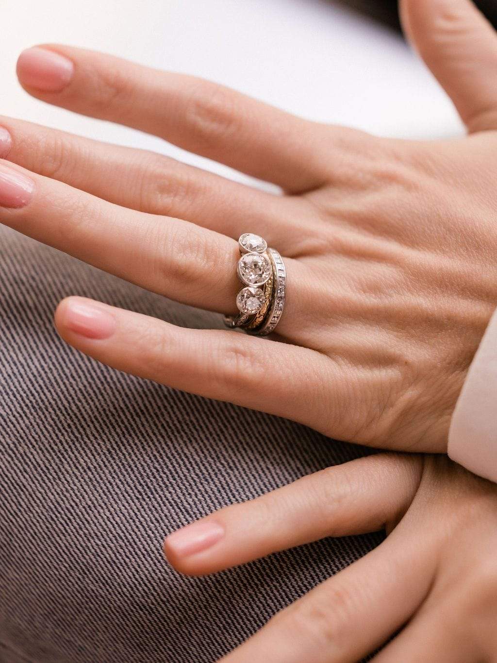 These diamonds are all bright and beautiful and create a beautiful spread across the finger! This ring also plays nicely with bands!