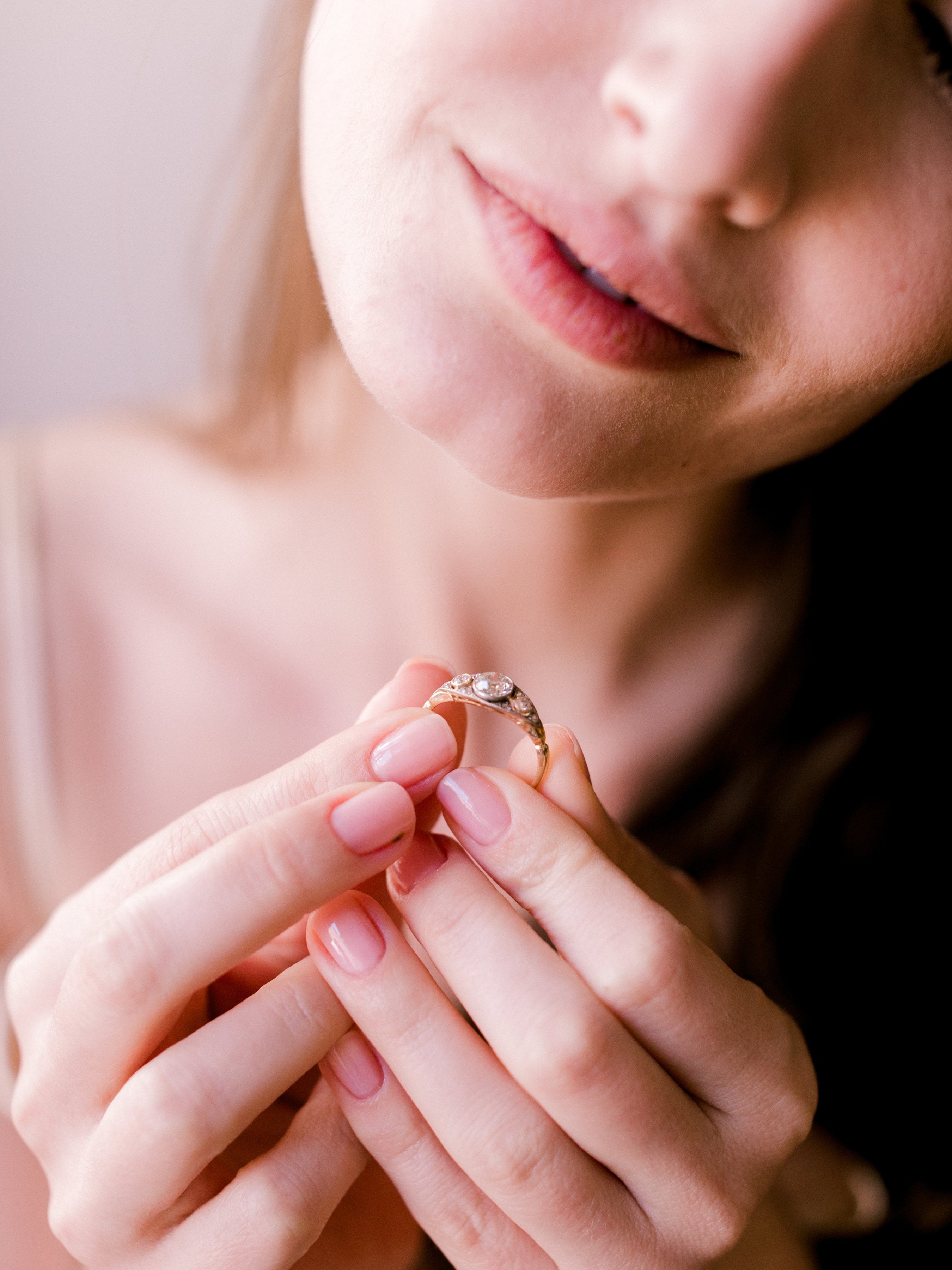 A low-profile stunner with tons of antique charm! The diamonds are bright and beautiful! The two-tone setting creates a unique look!