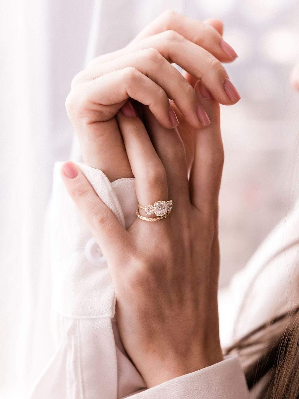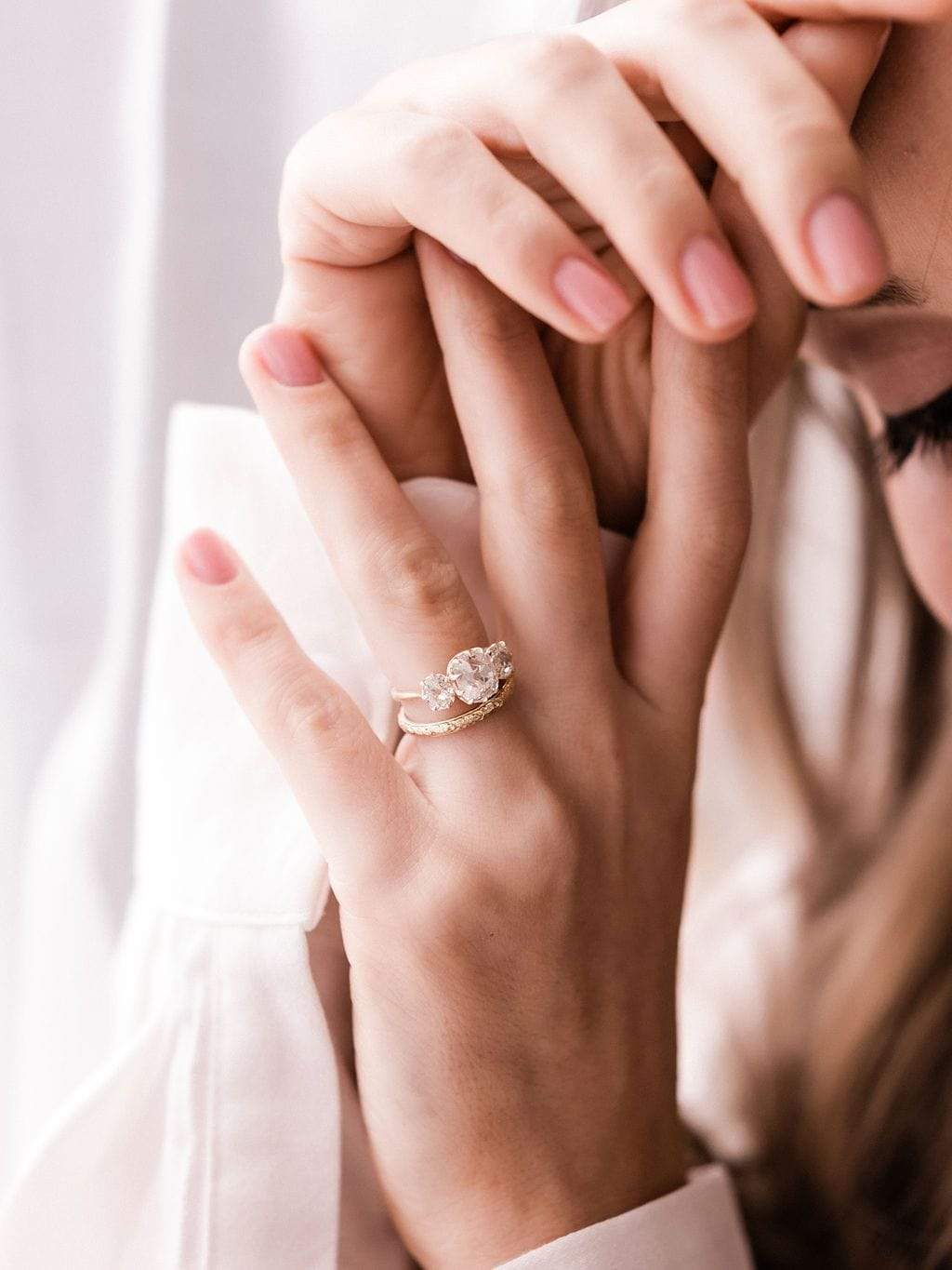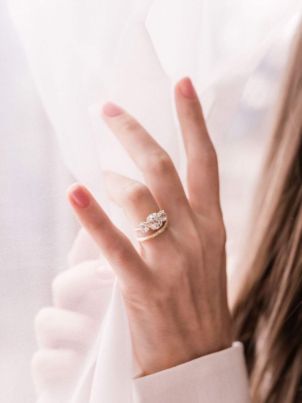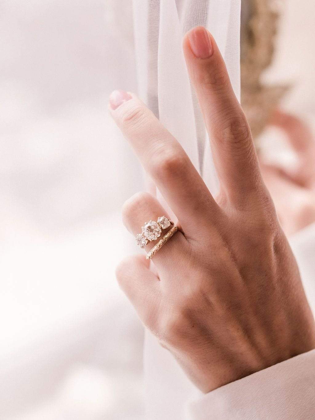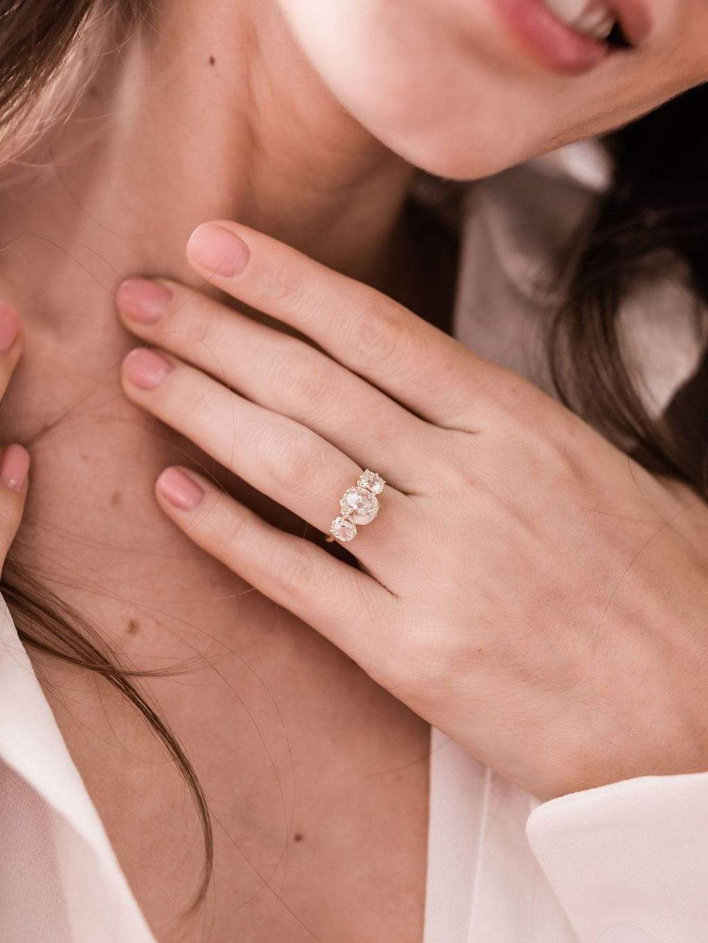 The Marielle 2.27 ring is a vintage inspired VB made diamond engagement ring. The ring centers a GIA certified 2.27 carat old mine cut diamond of L color, I2 clarity. To each side of the center stone is an elongated old mine cut diamond of approximately L-M color, VS clarity. The stones are set in a 10-prong 18 karat yellow gold setting. The ring is currently size 4.5 and can be resized!
