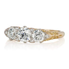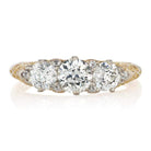 The Gentry ring is an antique diamond engagement ring. The ring centers a GIA certified 0.67-carat transitional cut diamond of I color, I1 clarity. The stone is set in an 18-karat yellow gold setting. A transitional cut diamond is set to each side of the center stone with 6 tiny old European cut diamonds in between. The ring is currently size 7.25 and can be resized!