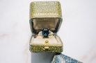 The hue of this sapphire is simply stunning. A deep blue with hints of green looks beautiful paired with our gorgeous gold and sleek baguettes that create a lovely finger wrap.