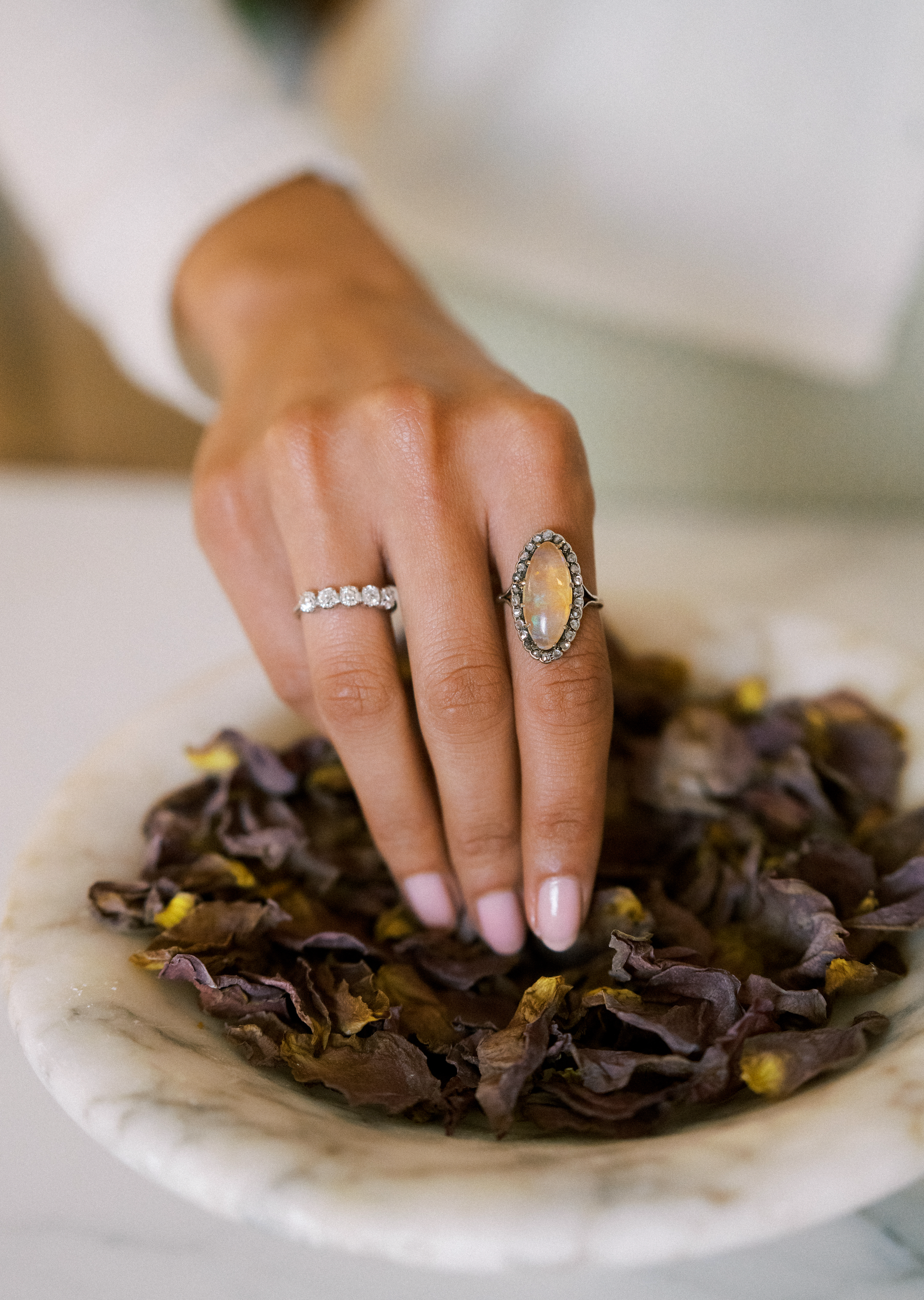 A vibrant opal speckled with rainbow shine is an etheral statement piece. Her dramatic elongation and rose cut halo add to her sophisticated look.