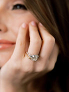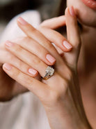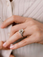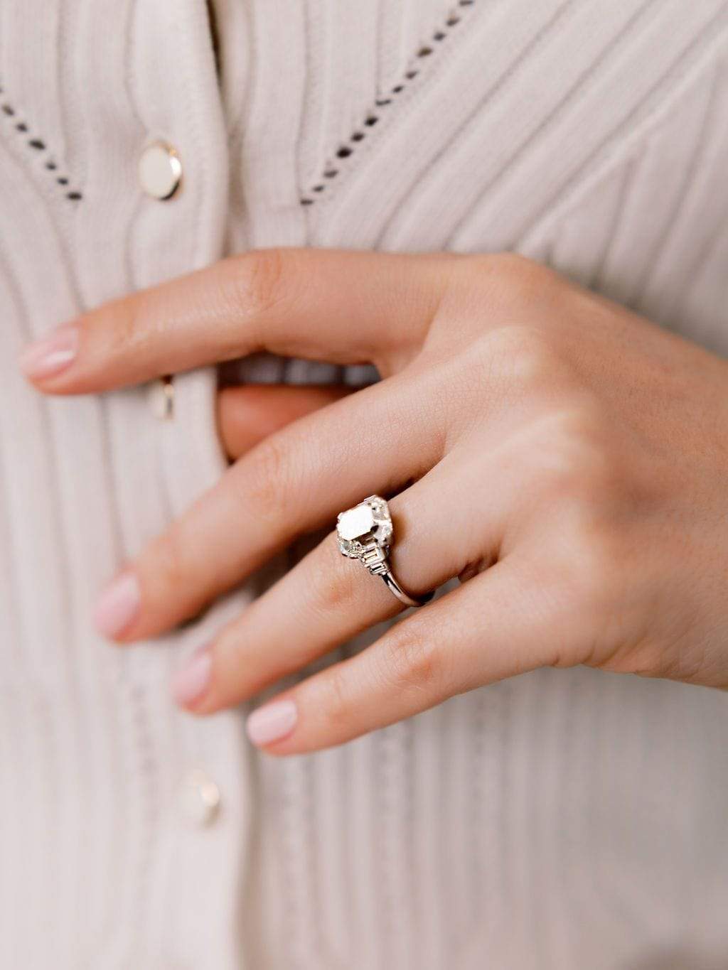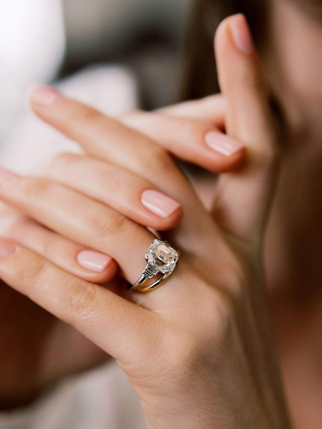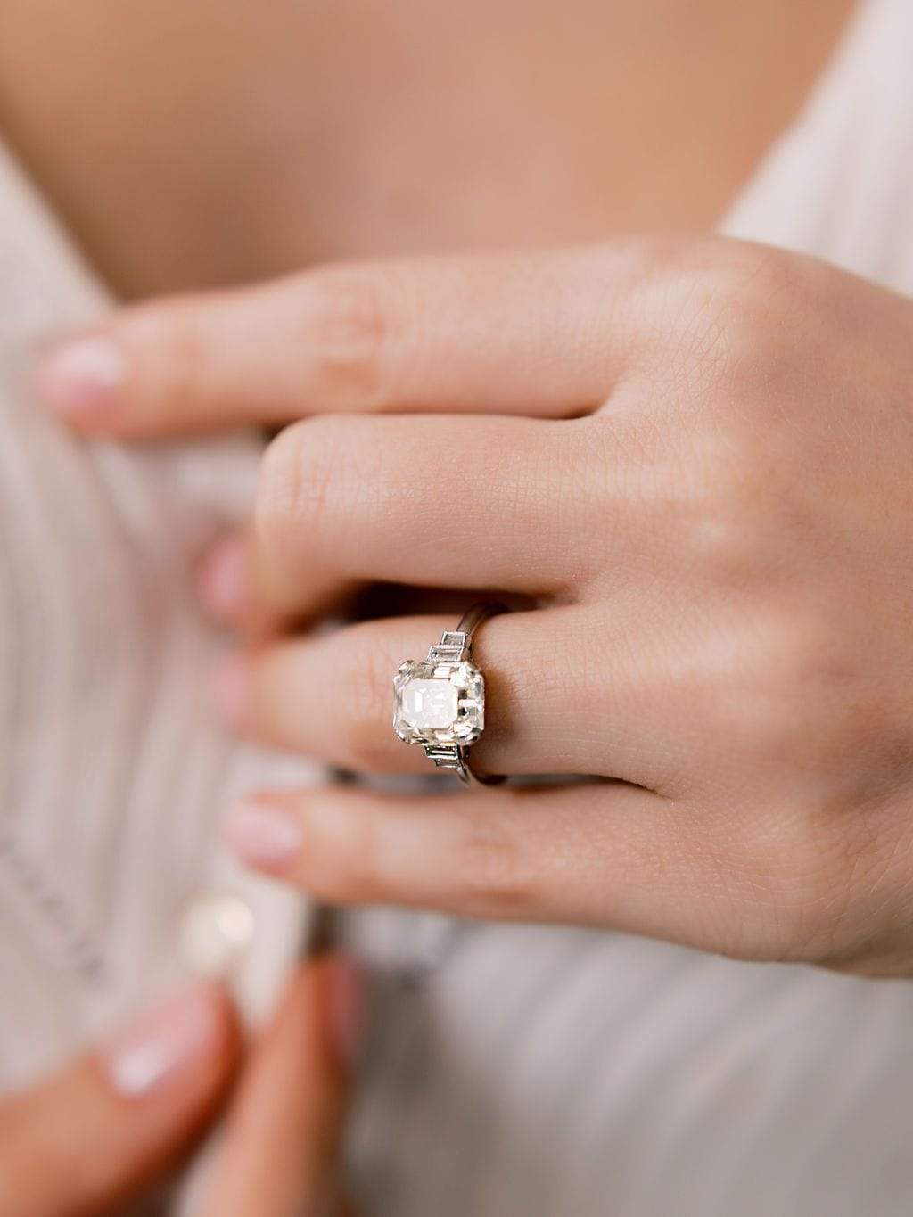 The Minette ring is a Art Deco-inspired diamond engagement ring. The ring centers a GIA certified 4.03-carat Asscher cut diamond of M color, VVS2 clarity. The stone is set in a 4 platinum setting. Two flanking baguettes are bezel-set to each side of the center stone with 4 small diamonds lining each side of the basket. The ring is currently size 6 and can be resized!