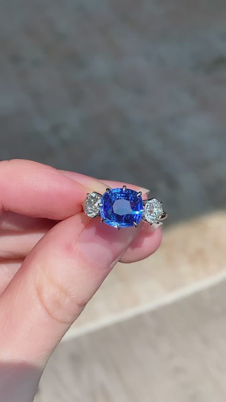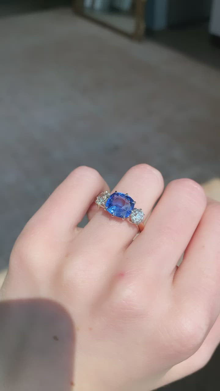 The Frankie ring is an authentic vintage ring from the Edwardian era circa 1910. The ring centers a C. Dunaigre Certified 4.03 carat no-heat Ceylon Sapphire of the most gorgeous hue. To one side of the center stone is a GIA certified 0.58ct old European cut diamond of J color, VS2 clarity and to the other side is a GIA Certified 0.65ct old European cut diamond of J color, SI2 clarity. The stones are set in platinum baskets on an 18 karat rose gold setting. The ring is currently size 6.25 and can be resized!