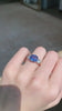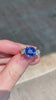 This center stone is the most beautiful blue hue with slight lavender tones and is perfectly complimented by bright and fiery Old European cut side stones, adding gorgeous shimmer to this stunning ring. Get her while she lasts.