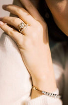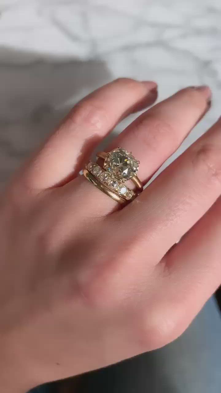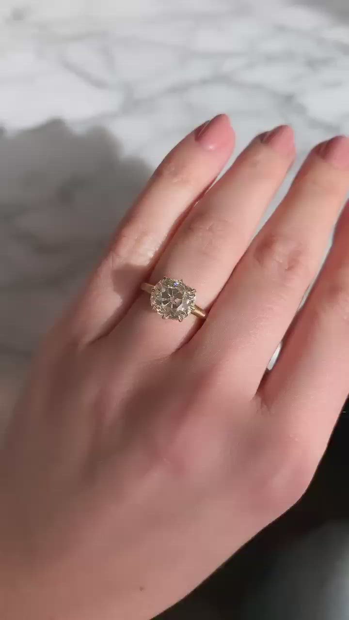 The Avery 4.21 ring is a VB-made diamond engagement ring with an authentic antique diamond designed and made here in NYC. The ring centers a GIA certified 4.21-carat old mine cut diamond of S-T color, VS1 clarity. The stone is East-West set in an 8-prong 18-karat yellow gold setting. The ring is currently size 5.75 and can be resized!
