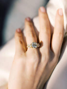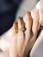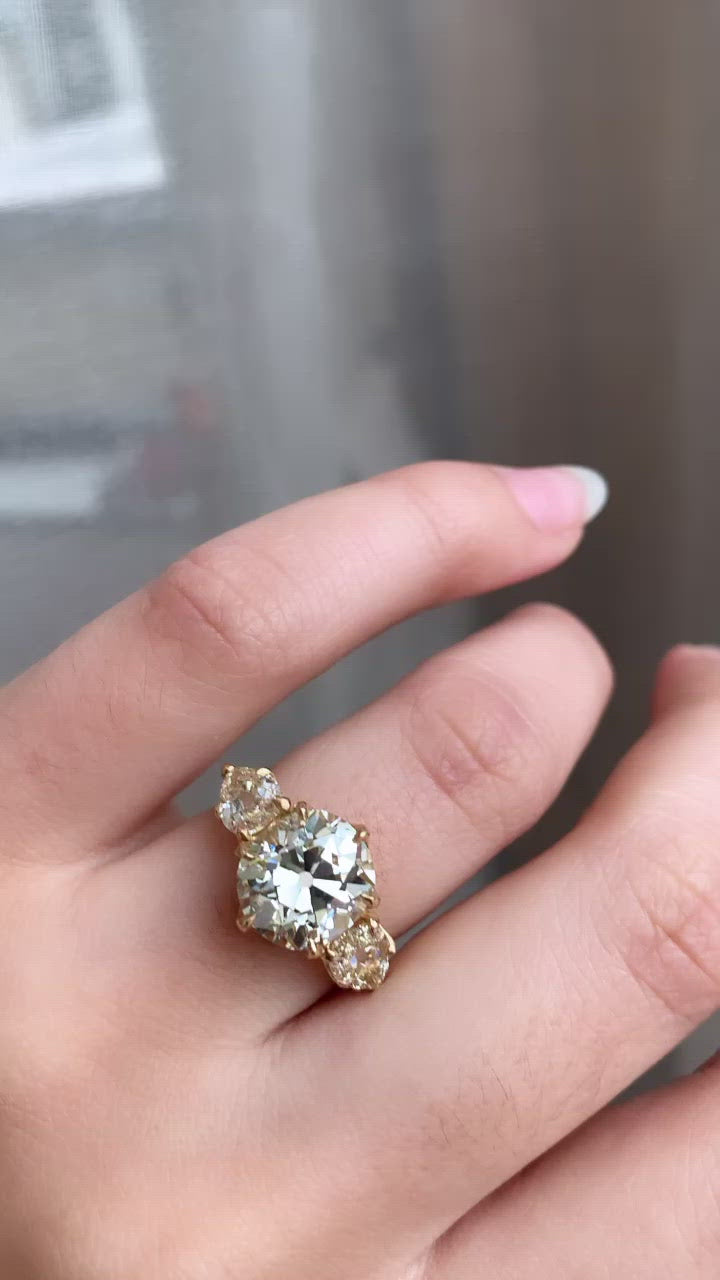 The Monroe 4.05 ring is a vintage-inspired VB-made diamond engagement ring with pear cut side stones. The ring centers a GIA certified 4.05-carat old mine cut diamond of S-T color, VS2 clarity. The stone is set in an 18-karat yellow gold setting. To each side of the center stone is a horizontally-set pear diamond, each approximately 0.85 carats. The ring is currently size 6.25 and can be resized!