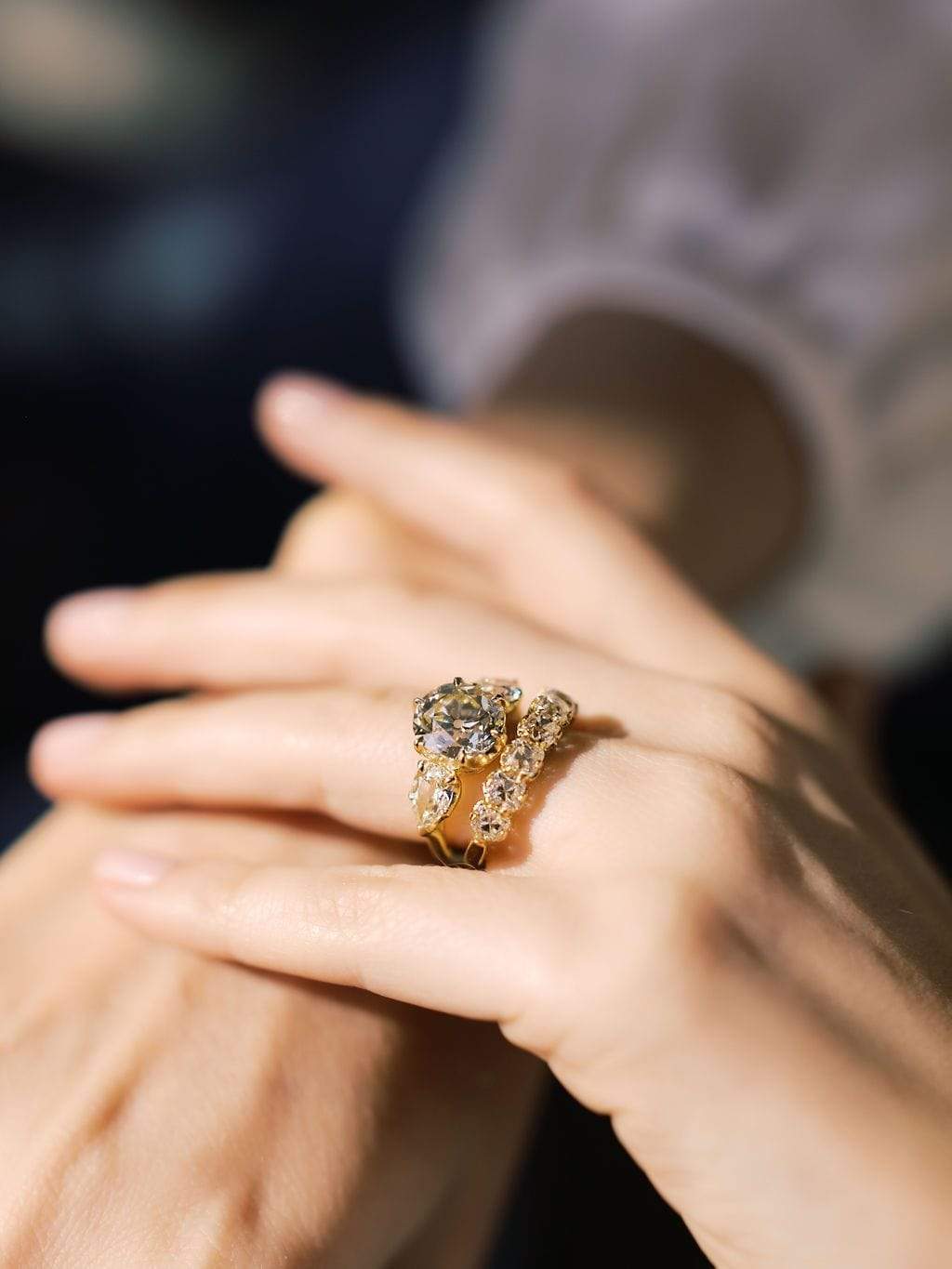 This center stone is just a dream. Crisp, bright, and chunky and perfectly paired with some antique pear diamonds on the sides. Definitely a big look!
