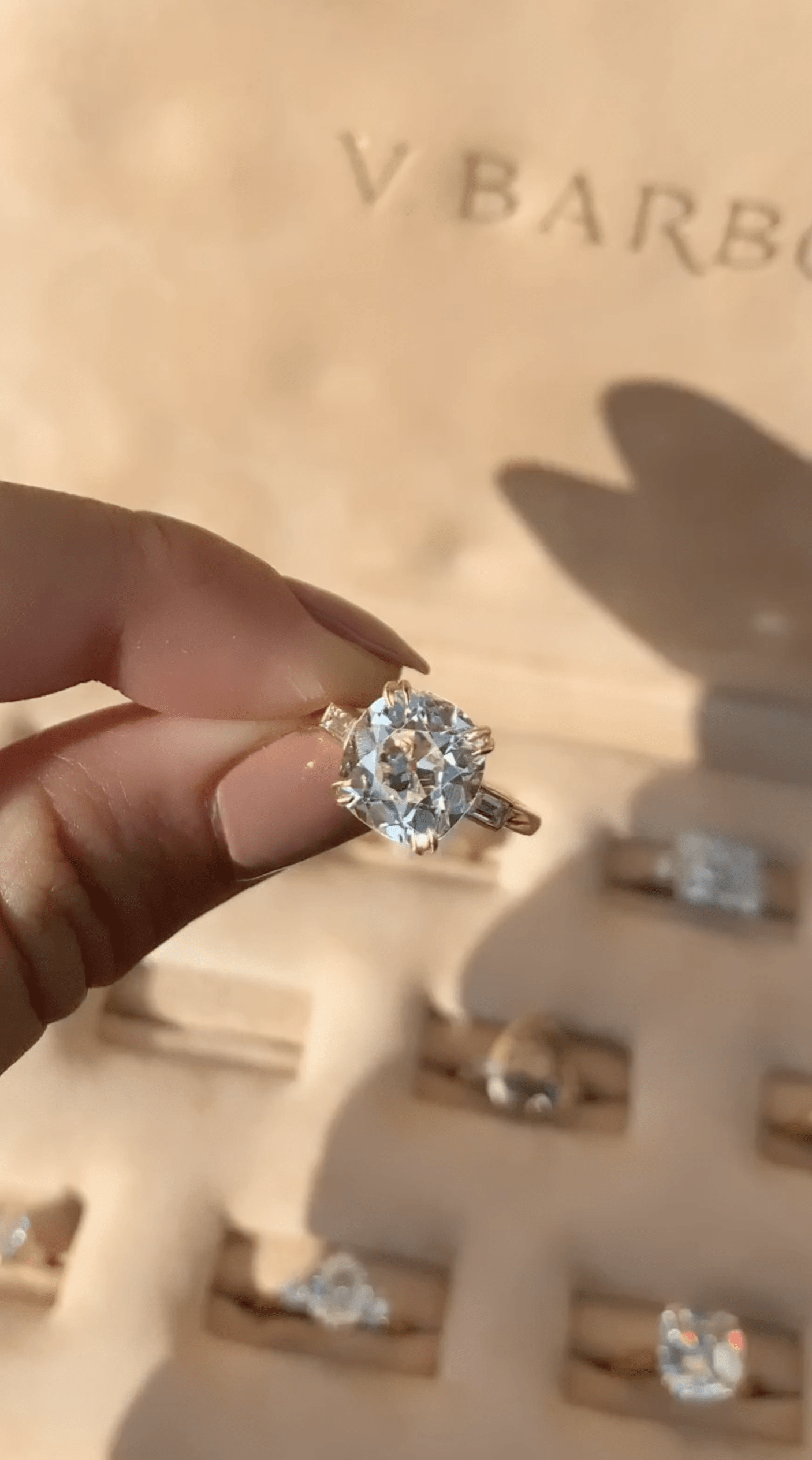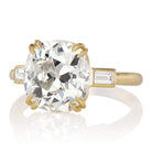 The Benedicte 4.24 ring is a vintage-inspired VB-made diamond engagement ring! The ring was inspired by the authentic vintage Art Deco ring the Benedicte. The ring centers a GIA certified 4.24carat old mine cut diamond of K color, SI1 clarity. The diamond is set in a 4 double prong 18kt yellow gold setting. The ring has a bezel-set baguette diamond of approximately I-J color, VS clarity to each side that combine for 0.22 carats. The diamonds are all set in an 18 karat yellow gold setting. The ring is currently size 6 and can be resized!